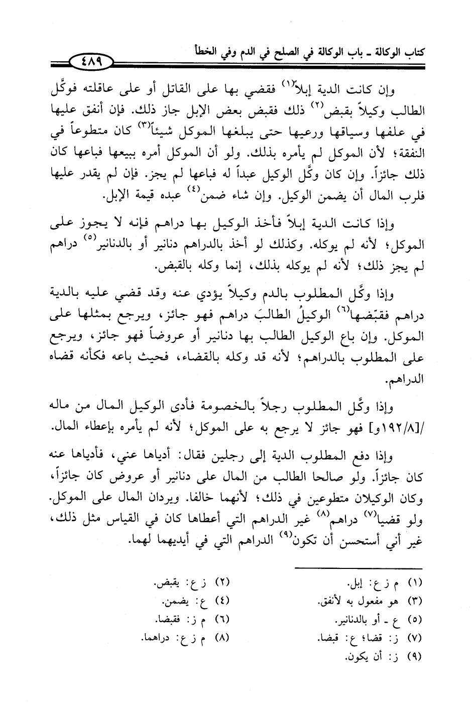 وإذا كانت الدية إبلاً فأخذ الوكيل بها دراهم فإنه لا يجوز على الموكل؛ لأنه لم يوكله. وكذلك لو أخذ بالدراهم دنانير أو بالدنانير (¬5) دراهم لم يجز ذلك؛ لأنه لم يوكله بذلك، إنما وكله بالقبض.