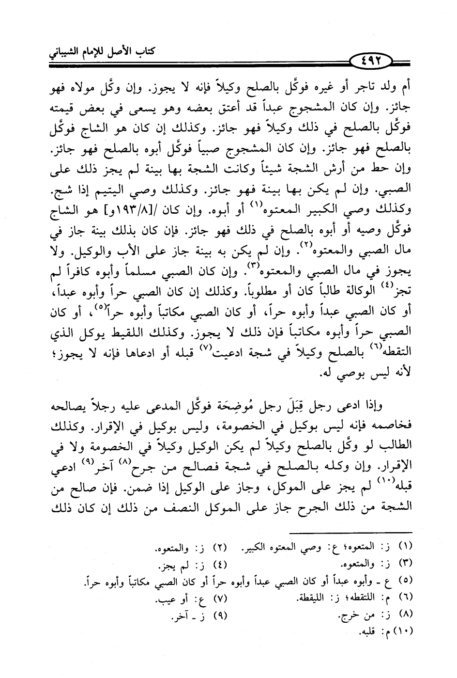 أم ولد تاجر أو غيره فوكَّل بالصلح وكيلاً فإنه لا يجوز. وإن وكَّل مولاه فهو جائزء وإن كان المشجوج عبداً قد أعتق بعضه وهو يسعى في بعض قيمته فوكَّل بالصلح في ذلك وكيلاً فهو جائز. وكذلك إن كان هو الشاج فوكَّل بالصلح فهو جائز. وإن كان المشجوج صبياً فوكَّل أبوه بالصلح فهو جائز. كان حط من أرش الشجة شيئاً وكانت الشجة بها بينة لم يجز ذلك على الصبي. وإن لم يكن بها بينة فهو جائز. وكذلك وصي اليتيم إذا شج. وكذلك وصي الكبير المعتوه (¬1) أو أبوه. وإن كان هو الشاج فوكَّل وصيه أو أبوه بالصلح في ذلك فهو جائز. فإن كان بذلك بينة جاز في مال الصبي والمعتوه (¬2). وإن لم يكن به بينة جاز على الأب والوكيل. ولا يجوز في مال الصبي والمعتوه (¬3). وإن كان الصبي مسلماً وأبوه كافراً لم تجز (¬4) الوكالة طالباً كان أو مطلوباً. وكذلك إن كان الصبي حراً وأبوه عبداً، أو كان الصبي عبداً وأبوه حراً، أو كان الصبي مكاتباً وأبوه حراً (¬5)، أو كان الصبي حراً وأبوه مكاتباً فإن ذلك لا يجوز. وكذلك اللقيط يوكل الذي التقطه (¬6) بالصلح وكيلاً في شجة ادعيت (¬7) قبله أو ادعاها فإنه لا يجوز؛ لأنه ليس بوصي له.