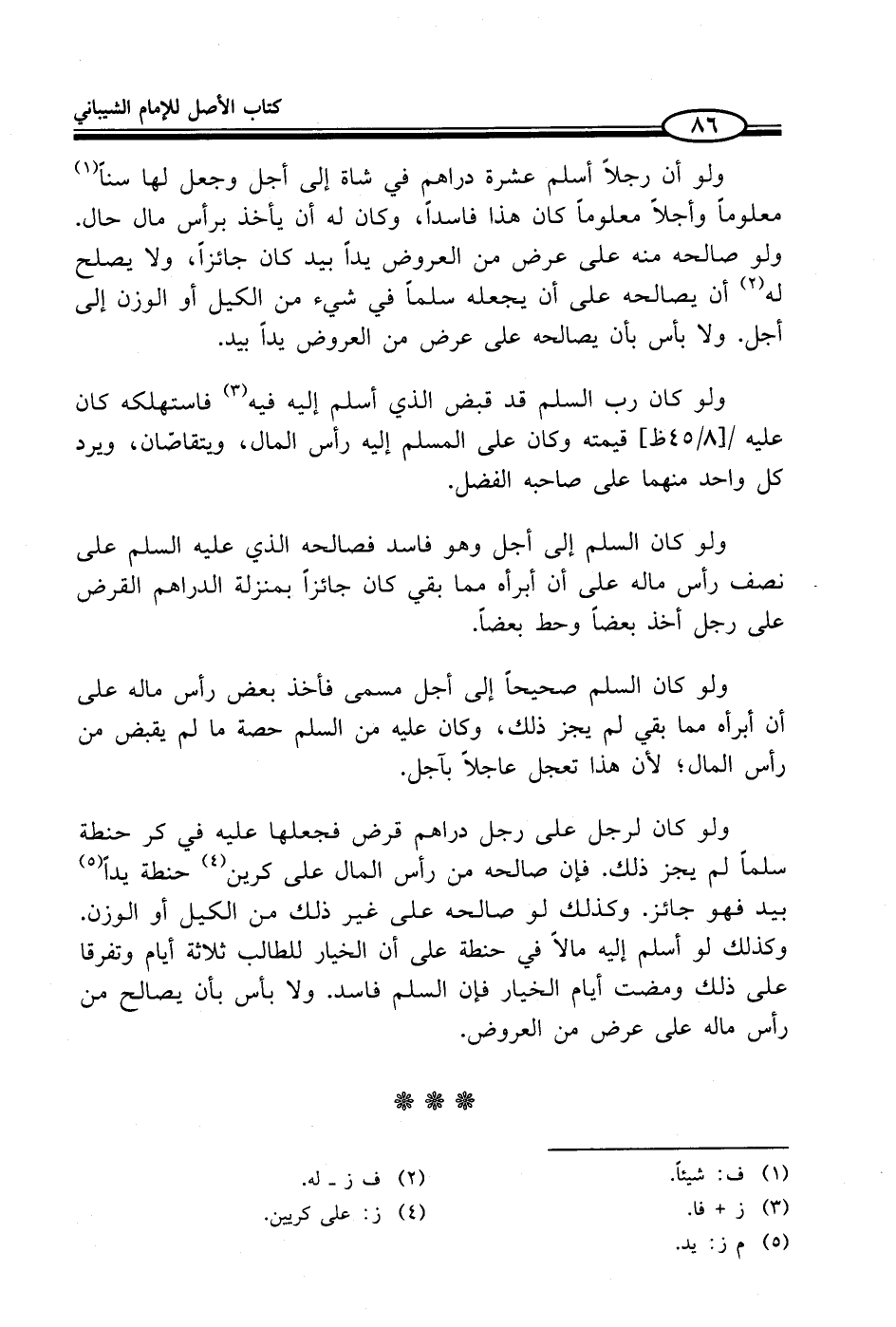 ولو أن رجلاً أسلم عشرة دراهم في شاة إلى أجل وجعل لها سناً (¬1) معلوماً وأجلاً معلوماً كان هذا فاسداً، وكان له أن يأخذ برأس مال حال. ولو صالحه منه على عرض من العروض يداً بيد كان جائزاً، ولا يصلح له (¬2) أن يصالحه على أن يجعله سلماً في شيء من الكيل أو الوزن إلى أجل. ولا بأس بأن يصالحه على عرض من العروض يداً بيد.