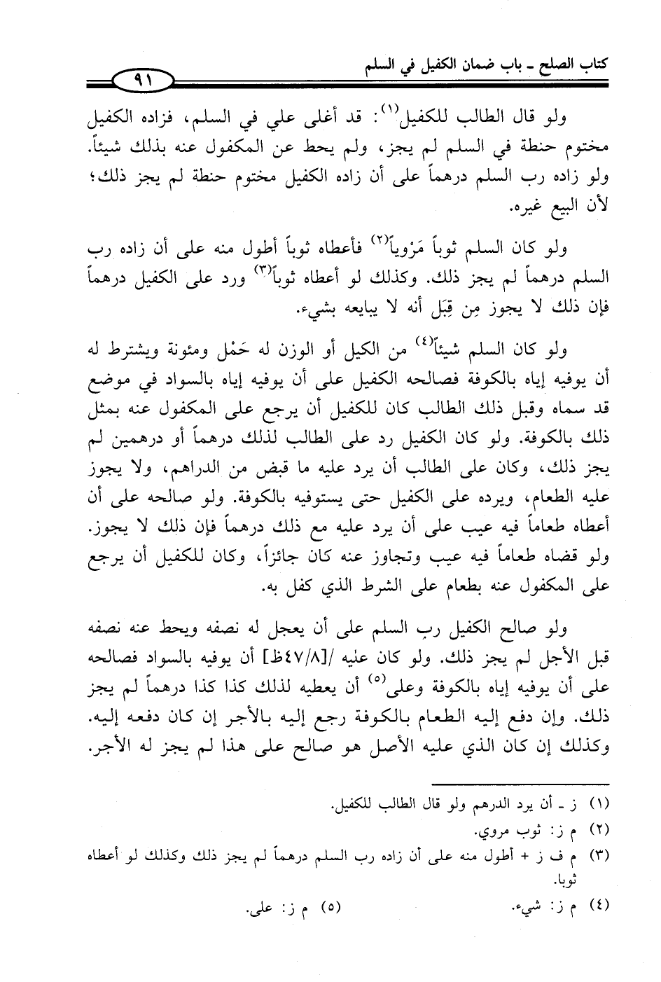 ولو كان السلم شيئاً (¬4) من الكيل أو الوزن له حَمْل ومئونة ويشترط له أن يوفيه إياه بالكوفة فصالحه الكفيل على أن يوفيه إياه بالسواد في موضع قد سماه وقبل ذلك الطالب كان للكفيل أن يرجع على المكفول عنه بمثل ذلك بالكوفة. ولو كان الكفيل رد على الطالب لذلك درهماً أو درهمين لم يجز ذلك، وكان على الطالب أن يرد عليه ما قبض من الدراهم، ولا يجوز عليه الطعام، ويرده على الكفيل حتى يستوفيه بالكوفة. ولو صالحه على أن أعطاه طعاماً فيه عيب على أن يرد عليه مع ذلك درهماً فإن ذلك لا يجوز. ولو قضاه طعاماً فيه عيب وتجاوز عنه هوإن جائزاً، وكان للكفيل أن يرجع على المكفول عنه بطعام على الشرط الذي كفل به.