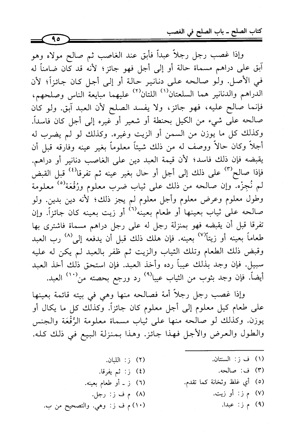 وإذا غصب رجل رجلاً عبداً فأبق عند الغاصب ثم صالح مولاه وهو آبق على دراهم مسماة حالة أو إلى أجل فهو جائز؛ لأنه قد كان ضامناً له في الأصل. ولو صالحه على دنانير حالة أو إلى أجل كان جائزاً؛ لأن الدراهم والدنانير هما السلعتان (¬1) اللتان (¬2) عليهما مبايعة الناس وصلحهم، فإنما صالح عليه، فهو جائز، ولا يفسد الصلح لأن العبد آبق. ولو كان صالحه على شيء من الكيل بحنطة أو شعير أو غيره إلى أجل كان فاسداً. وكذلك كل ما يوزن من السمن أو الزيت وغيره. وكذلك لو لم يضرب له أجلاً وكان حالاً ووصف له من ذلك شيئاً معلوماً بغير عينه وفارقه قبل أن يقبضه فإن ذلك فاسد؛ لأن قيمة العبد دين على الغاصب دنانير أو دراهم. فإذا صالح (¬3) على ذلك إلى أجل أو حال بغير عينه ثم تفرقا (¬4) قبل القبض لم نُجِزْه. كان صالحه من ذلك على ثياب ضرب معلوم ورُقْعَة (¬5) معلومة وطول معلوم وعرض معلوم وأجل معلوم لم يجز ذلك؛ لأنه دين بدين. ولو صالحه على ثياب بعينها أو طعام بعينه (¬6) أو زيت بعينه كان جائزاً. وإن تفرقا قبل أن يقبضه فهو بمنزلة رجل له على رجل دراهم مسماة فاشترى بها طعاماً بعينه أو زيتاً (¬7) بعينه. فإن هلك ذلك قبل أن يدفعه إلى (¬8) رب العبد وقبض ذلك الطعام وتلك الثياب والزيت ثم ظفر بالعبد لم يكن له عليه سبيل. فإن وجد بذلك عيباً رده وأخذ العبد. فإن استحق ذلك أخذ العبد أيضاً. فإن وجد بثوب من الثياب عيبا (¬9) رد ورجع بحصته من (¬10) العبد.