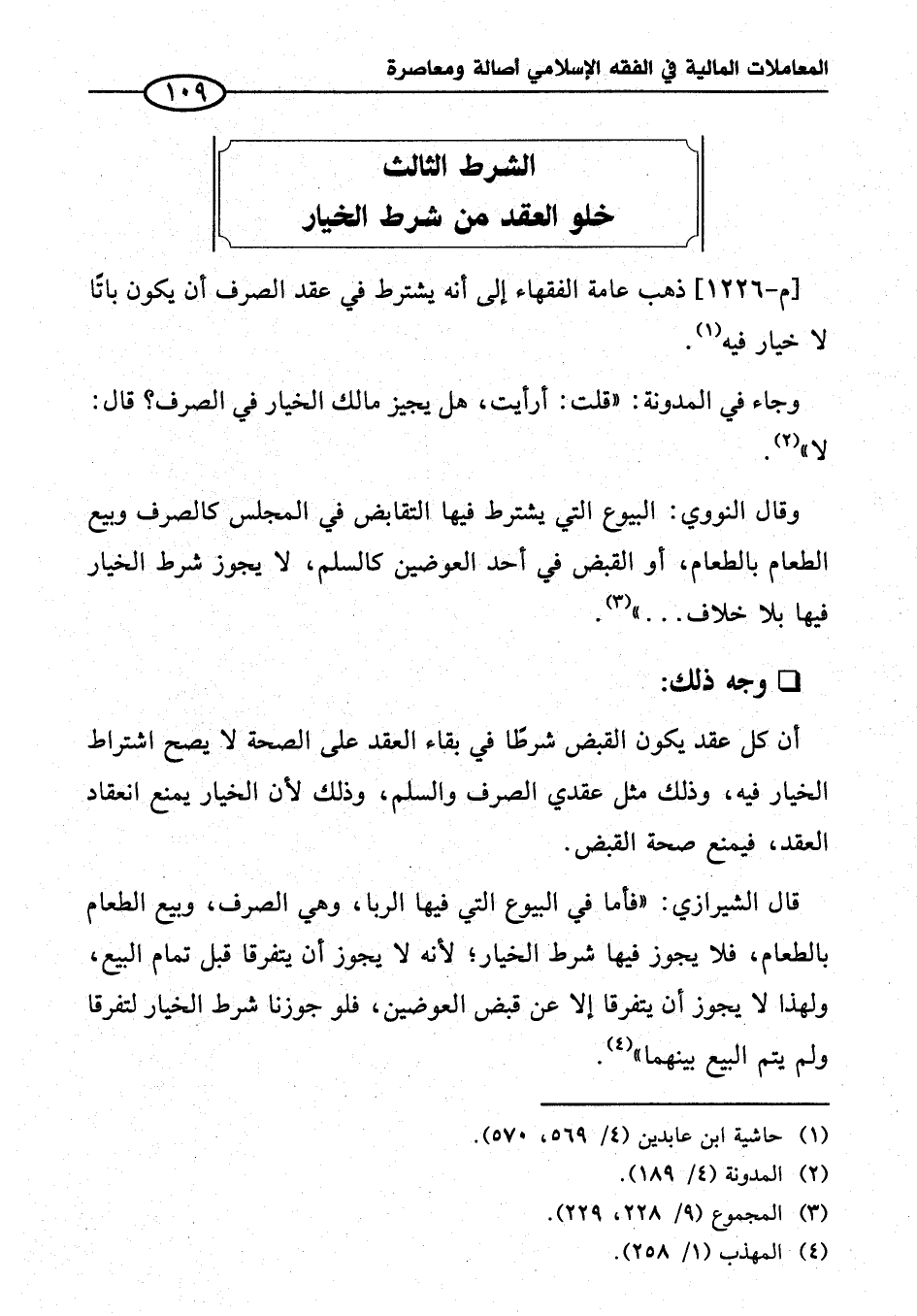 [م - ١٢٢٦] ذهب عامة الفقهاء إلى أنه يشترط في عقد الصرف أن يكون باتًّا لا خيار فيه (¬١).