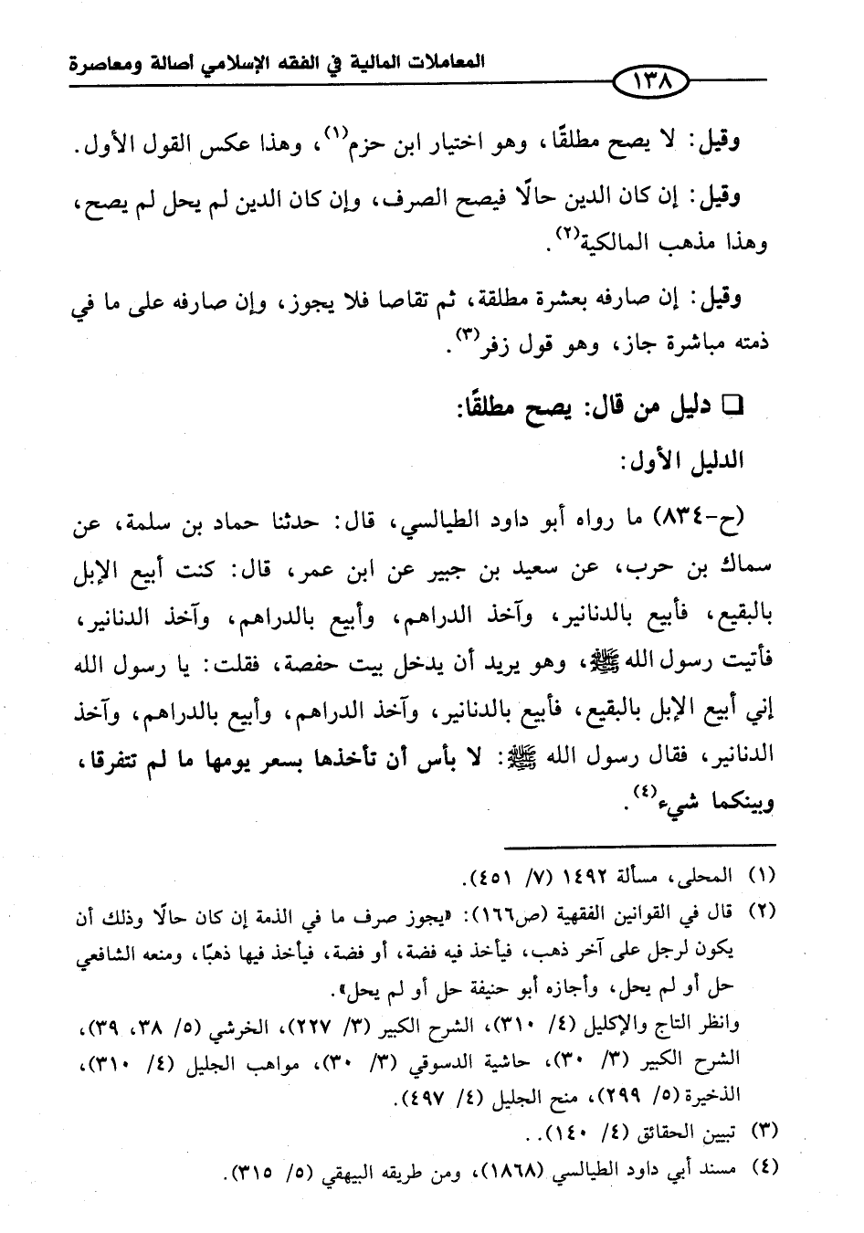 (¬٢) قال في القوانين الفقهية (ص ١٦٦): "يجوز صرف ما في الذمة إن كان حالًا وذلك أن يكون لرجل على آخر ذهب، فيأخذ فيه فضة، أو فضة، فيأخذ فيها ذهباً، ومنعه الشافعي حل أو لم يحل، وأجازه أبو حنيفة حل أو لم يحل".