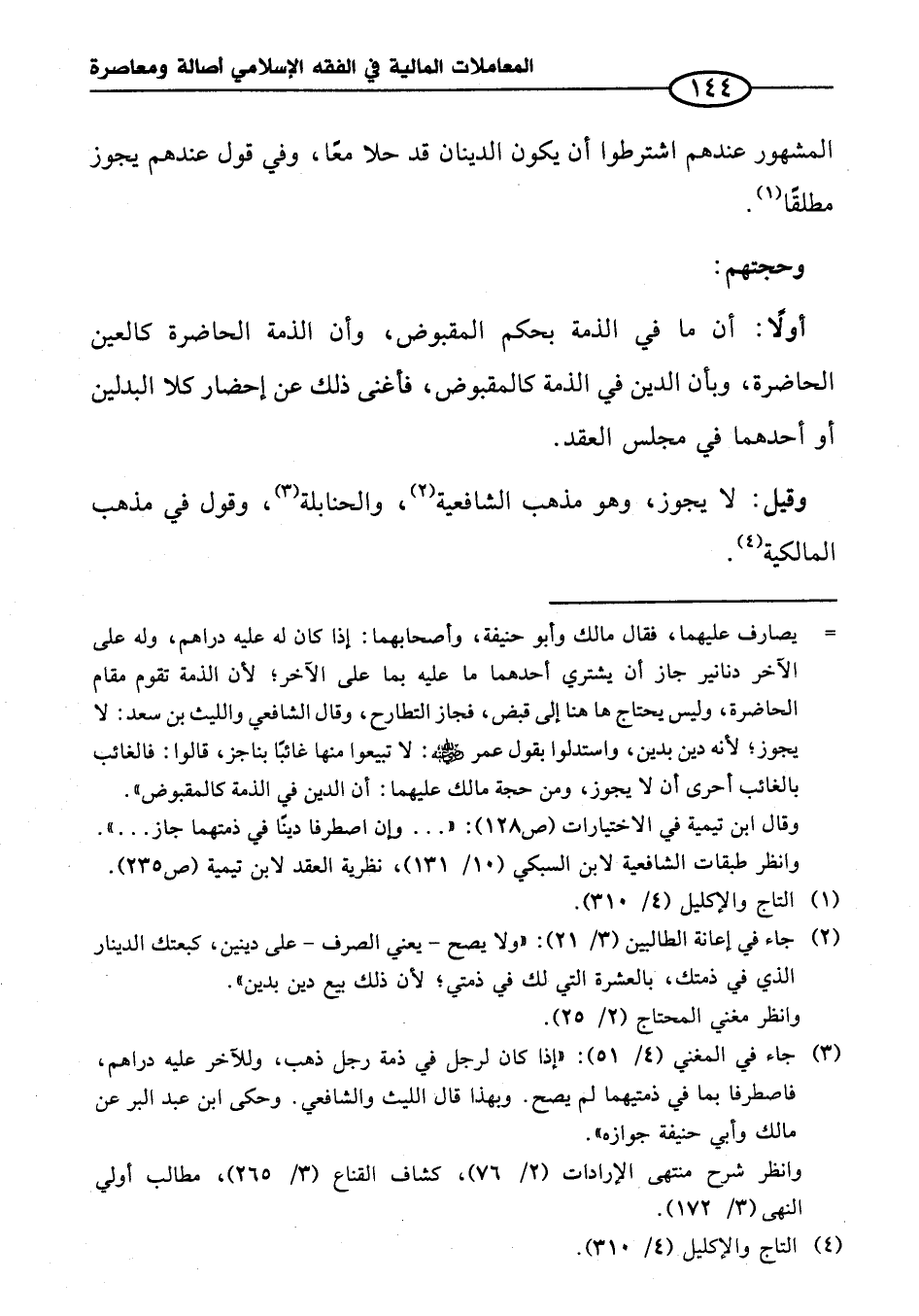 (¬٣) جاء في المغني (٤/ ٥١): "إذا كان لرجل في ذمة رجل ذهب، وللآخر عليه دراهم، فاصطرفا بما في ذمتيهما لم يصح. وبهذا قال الليث والشافعي. وحكى ابن عبد البر عن مالك وأبي حنيفة جوازه".