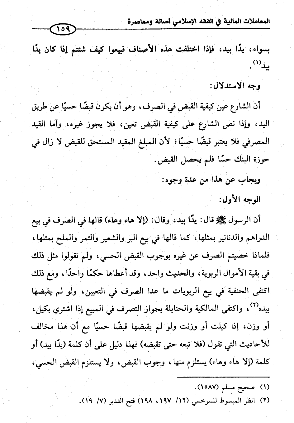أن الرسول - صلى الله عليه وسلم - قال: يدًا بيد، وقال: (إلا هاء وهاء) قالها في الصرف في بيع الدراهم والدنانير بمثلها، كما قالها في بيع البر والشعير والتمر والملح بمثلها، فلماذا خصيتم الصرف عن غيره بوجوب القبض الحسي، ولم تقولوا مثل ذلك في بقية الأموال الربوية، والحديث واحد، وقد أعطاها حكمًا واحدًا، ومع ذلك اكتفى الحنفية في بيع الربويات ما عدا الصرف في التعيين، ولو لم يقبضها بيده (¬٢)، واكتفى المالكية والحنابلة بجواز التصرف في المبيع إذا اشتري بكيل، أو وزن، إذا كيلت أو وزنت ولو لم يقبضها قبضًا حسيًا مع أن هذا مخالف للأحاديث التي تقول (فلا تبعه حتى تقبضه) فهذا دليل على أن كلمة (يدًا بيد) أو كلمة (إلا هاء وهاء) يستلزم منها، وجوب القبض، ولا يستلزم القبض الحسي،