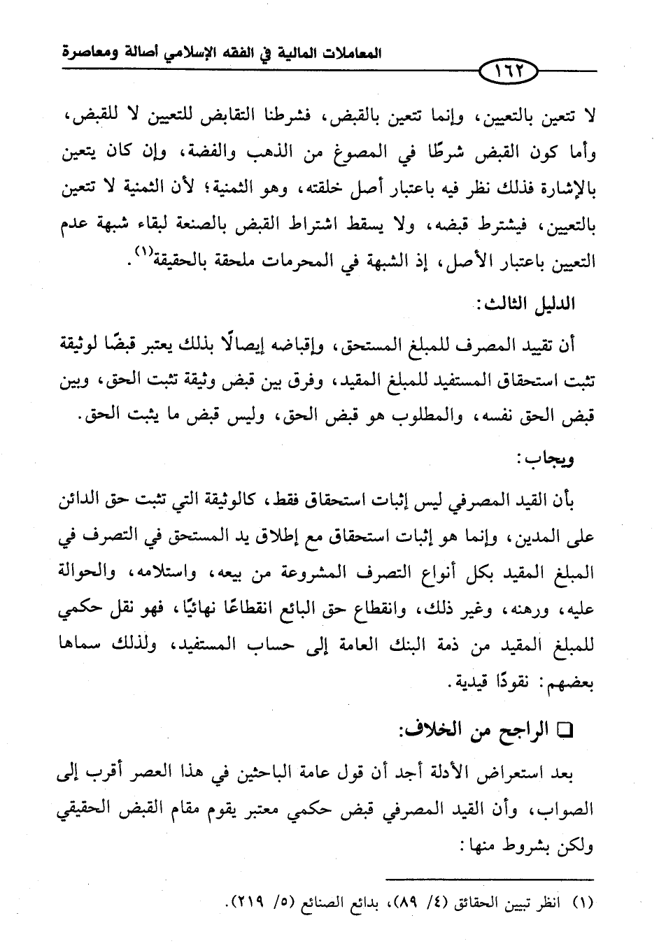 أن تقييد المصرف للمبلغ المستحق، وإقباضه إيصالًا بذلك يعتبر قبضًا لوثيقة تثبت استحقاق المستفيد للمبلغ المقيد، وفرق بين قبض وثيقة تثبت الحق، وبين قبض الحق نفسه، والمطلوب هو قبض الحق، وليس قبض ما يثبت الحق.