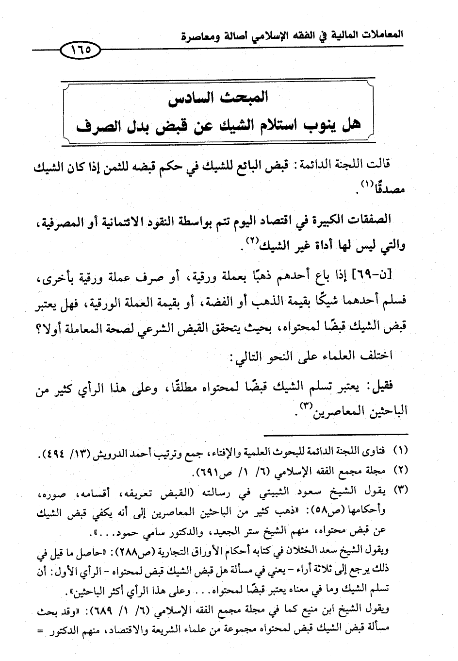 (¬٣) يقول الشيخ سعود الشبيتي في رسالته (القبض تعريفه، أقسامه، صوره، وأحكامها (ص ٥٨): "ذهب كثير من الباحثين المعاصرين إلى أنه يكفي قبض الشيك عن قبض محتواه، منهم الشيخ ستر الجعيد، والدكتور سامي حمود ... ".