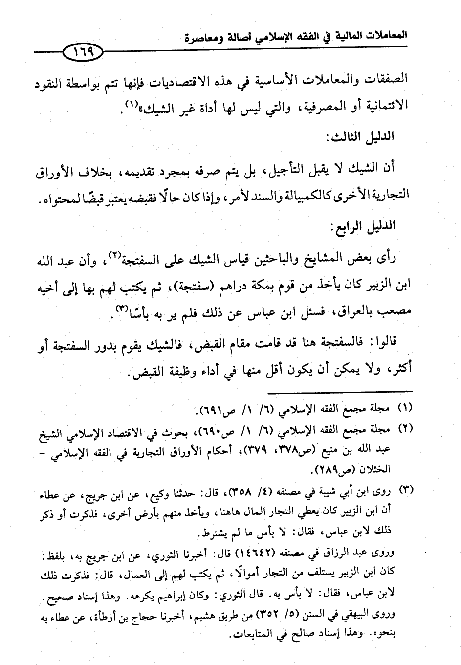 رأى بعض المشايخ والباحثين قياس الشيك على السفتجة (¬٢)، وأن عبد الله ابن الزبير كان يأخذ من قوم بمكة دراهم (سفتجة)، ثم يكتب لهم بها إلى أخيه مصعب بالعراق، فسئل ابن عباس عن ذلك فلم ير به بأسًا (¬٣).