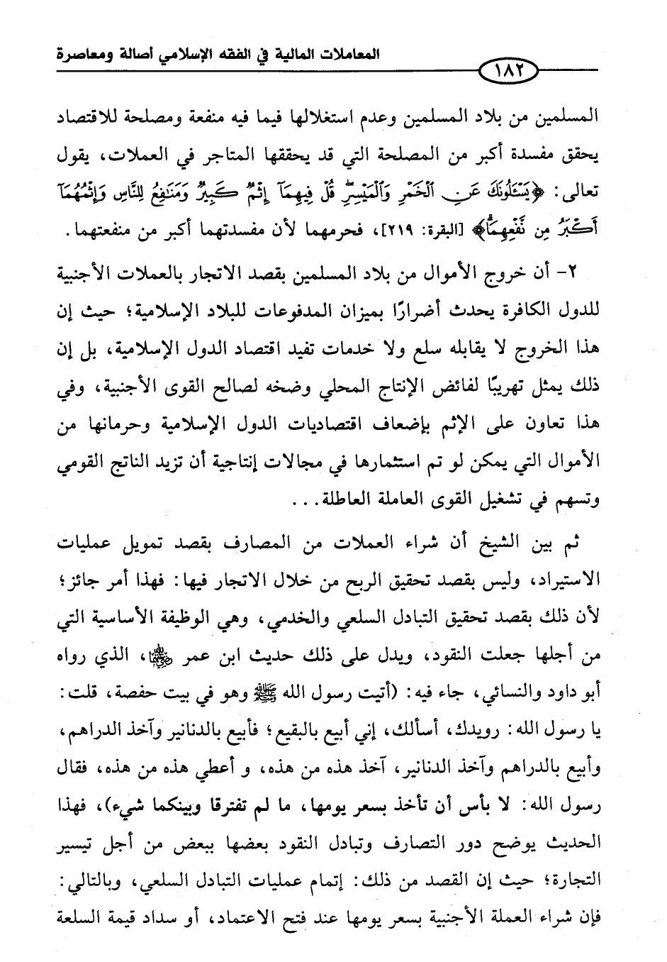 المسلمين من بلاد المسلمين وعدم استغلالها فيما فيه منفعة ومصلحة للاقتصاد يحقق مفسدة أكبر من المصلحة التي قد يحققها المتاجر في العملات، يقول تعالى: {يَسْأَلُونَكَ عَنِ الْخَمْرِ وَالْمَيْسِرِ قُلْ فِيهِمَا إِثْمٌ كَبِيرٌ وَمَنَافِعُ لِلنَّاسِ وَإِثْمُهُمَا أَكْبَرُ مِنْ نَفْعِهِمَا} [البقرة: ٢١٩] فحرمهما لأن مفسدتهما أكبر من منفعتهما.