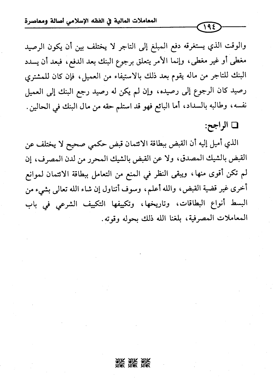 الذي أميل إليه أن القبض ببطاقة الائتمان قبض حكمي صحيح لا يختلف عن القبض بالشيك المصدق، ولا عن القبض بالشيك المحرر من لدن المصرف، إن لم تكن أقوى منها، ويبقى النظر في المنع من التعامل ببطاقة الائتمان لموانع أخرى غير قضية القبض، والله أعلم، وسوف أتناول إن شاء الله تعالى بشيء من البسط أنواع البطاقات، وتاريخها، وتكييفها التكييف الشرعي في باب المعاملات المصرفية، بلغنا الله ذلك بحوله وقوته.