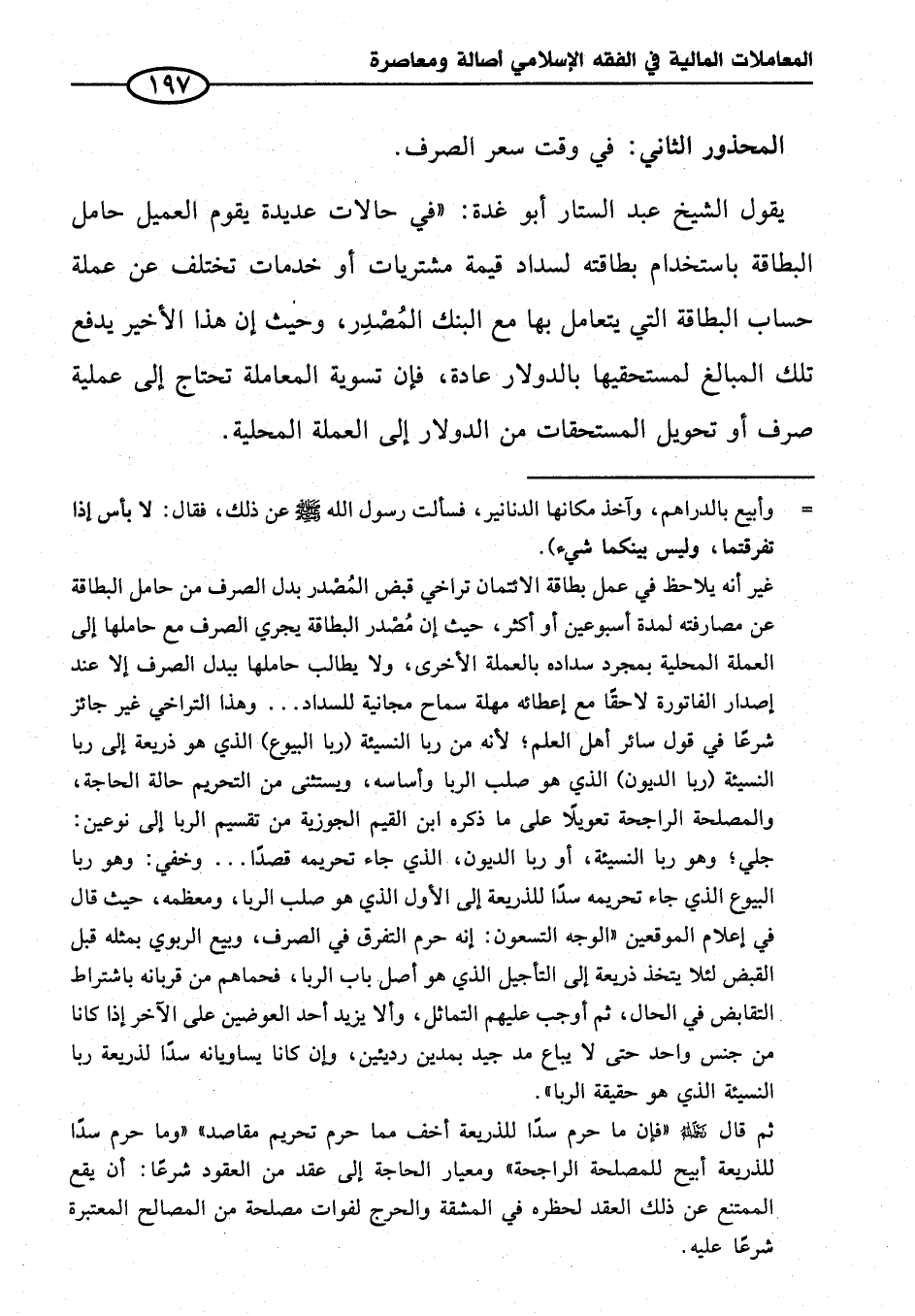 غير أنه يلاحظ في عمل بطاقة الائتمان تراخي قبض المُصْدر بدل الصرف من حامل البطاقة عن مصارفته لمدة أسبوعين أو أكثر، حيث إن مُصْدر البطاقة يجري الصرف مع حاملها إلى العملة المحلية بمجرد سداده بالعملة الأخرى، ولا يطالب حاملها بيدل الصرف إلا عند إصدار الفاتورة لاحقًا مع إعطائه مهلة سماح مجانية للسداد ... وهذا التراخي غير جائز شرعًا في قول سائر أهل العلم؛ لأنه من ربا النسيئة (ربا البيوع) الذي هو ذريعة إلى ربا النسيئة (ربا الديون) الذي هو صلب الربا وأساسه، ويستثنى من التحريم حالة الحاجة، والمصلحة الراجحة تعويلًا على ما ذكره ابن القيم الجوزية من تقسيم الربا إلى نوعين: جلي؛ وهو ربا النسيئة، أو ربا الديون، الذي جاء تحريمه قصدًا ... وخفي: وهو ربا البيوع الذي جاء تحريمه سدًا للذريعة إلى الأول الذي هو صلب الريا، ومعظمه، حيث قال في إعلام الموقعين "الوجه التسعون: إنه حرم التفرق في الصرف، وبيع الربوي بمثله قبل القبض لئلا يتخذ ذريعة إلى التأجيل الذي هو أصل باب الربا، فحماهم من قربانه باشتراط التقابض في الحال، ثم أوجب عليهم التماثل، وألا يزيد أحد العوضين على الآخر إذا كانا من جنس واحد حتى لا يباع مد جيد بمدين رديئين، وإن كانا يساويانه سدًا لذريعة ربا النسيئة الذي هو حقيقة الربا".
