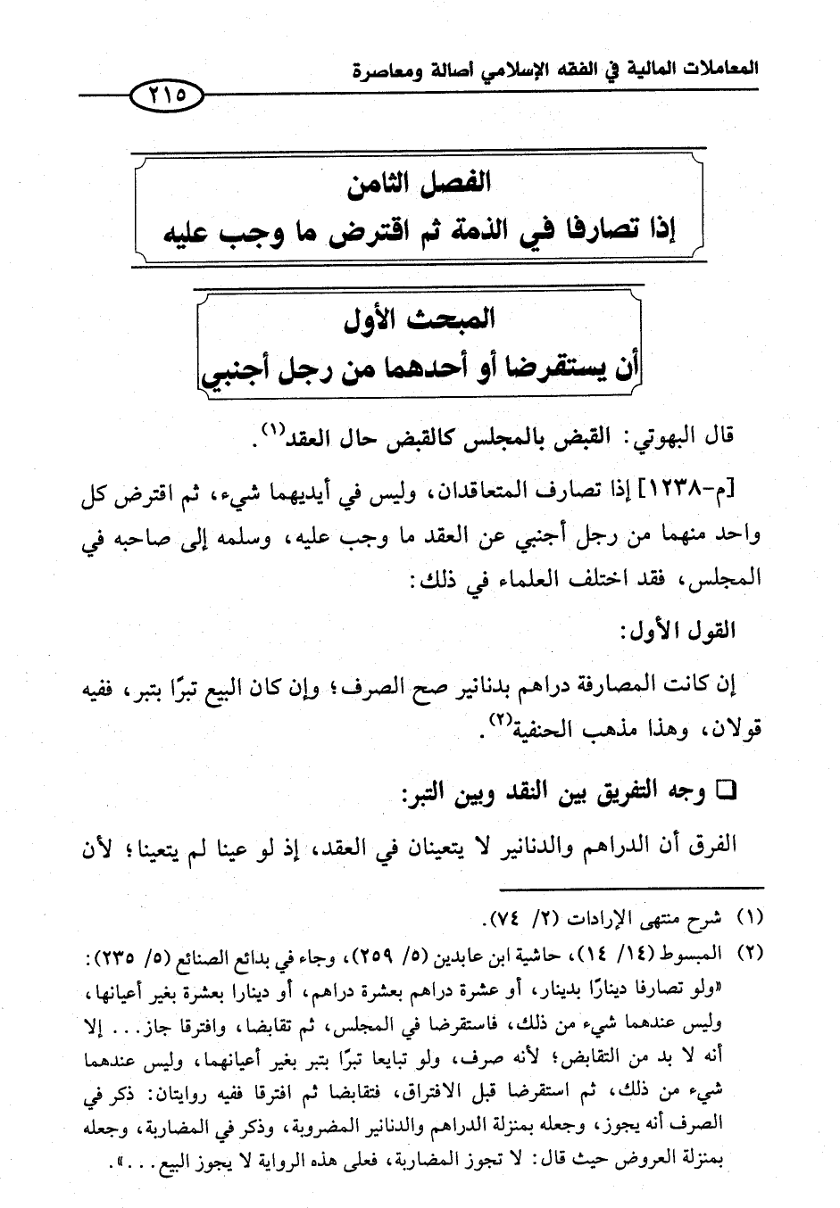 (¬٢) المبسوط (١٤/ ١٤)، حاشية ابن عابدين (٥/ ٢٥٩)، وجاء في بدائع الصنائع (٥/ ٢٣٥): "ولو تصارفا دينارًا بدينار، أو عشرة دراهم بعشرة دراهم، أو دينارا بعشرة بغير أعيانها، وليس عندهما شيء من ذلك، فاستقرضا في المجلس، ثم تقابضا، وافترفا جاز ... إلا أنه لا بد من التقابض؛ لأنه صرف، ولو تبايعا تبرًا بتبر بغير أعيانهما، وليس عندهما شيء من ذلك، ثم استقرضا قبل الافتراق، فتقابضا ثم افترقا ففيه روايتان: ذكر في الصرف أنه يجوز، وجعله بمنزلة الدراهم والدنانير المضروبة، وذكر في المضاربة، وجعله بمنزلة العروض حيث قال: لا تجوز المضاربة، فعلى هذه الرواية لا يجوز البيع ... ".