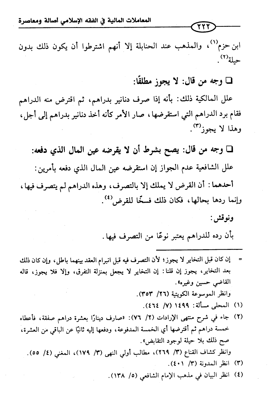 (¬٢) جاء في شرح منتهى الإرادات (٢/ ٧٦): "صارف دينارًا بعشرة دراهم صفقة، فأعطاه خمسة دراهم ثم أقترضها أي الخمسة المدفوعة، ودفعها إليه ثانيًا عن الباقي من العشرة، صح ذلك بلا حيلة لوجود التقابض".