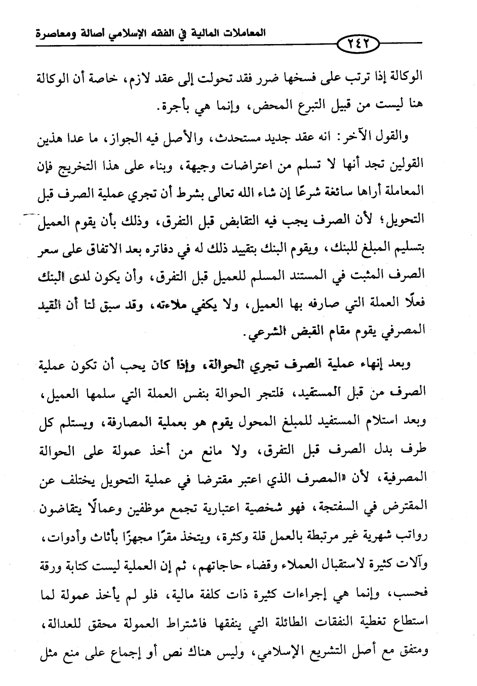 والقول الآخر: أنه عقد جديد مستحدث، والأصل فيه الجواز، ما عدا هذين القولين تجد أنها لا تسلم من اعتراضات وجيهة، وبناء على هذا التخريج فإن المعاملة أراها سائغة شرعًا إن شاء الله تعالى بشرط أن تجري عملية الصرف قبل التحويل؛ لأن الصرف يجب فيه التقابض قبل التفرق، وذلك بأن يقوم العميل بتسليم المبلغ للبنك، ويقوم البنك بتقييد ذلك له في دفاتره بعد الاتفاق على سعر الصرف المثبت في المستند المسلم للعميل قبل التفرق، وأن يكون لدى البنك فعلًا العملة التي صارفه بها العميل، ولا يكفي ملاءته, وقد سبق لنا أن القيد المصرفي يقوم مقام القبض الشرعي.