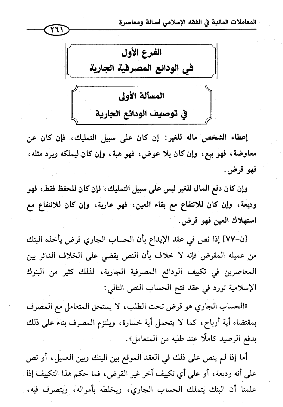 [ن - ٧٧] إذا نص في عقد الإيداع بأن الحساب البخاري قرض يأخذه البنك من عميله المقرض فإنه لا خلاف بأن النص يقضي على الخلاف الدائر بين المعاصرين في تكييف الودائع المصرفية الجارية، لذلك كثير من البنوك الإِسلامية تورد في عقد فتح الحساب النص التالي: