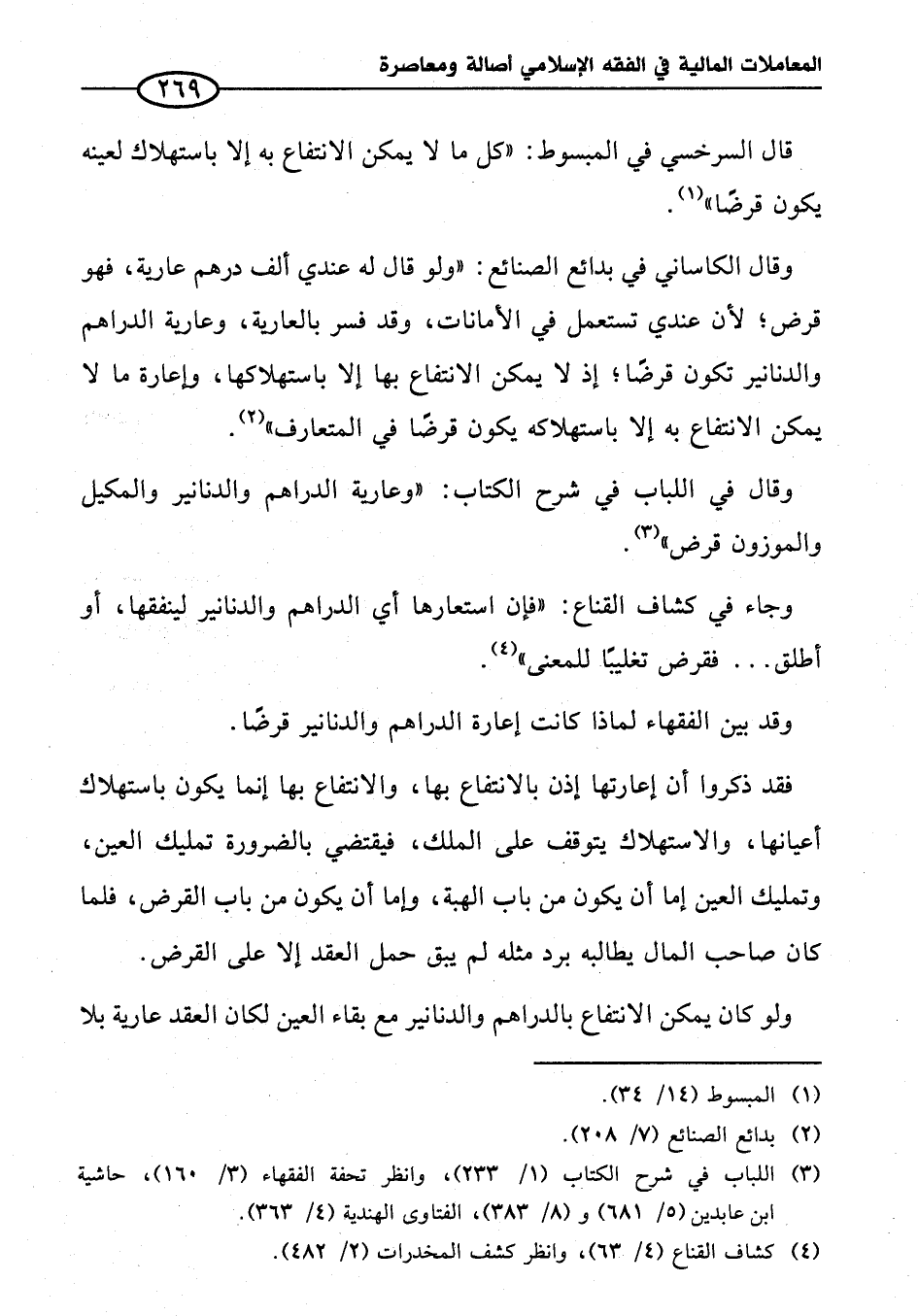 وقال الكاساني في بدائع الصنائع: "ولو قال له عندي ألف درهم عارية، فهو قرض؛ لأن عندي تستعمل في الأمانات، وقد فسر بالعارية، وعارية الدراهم والدنانير تكون قرضًا؛ إذ لا يمكن الانتفاع بها إلا باستهلاكها، وإعارة ما لا يمكن الانتفاع به إلا باستهلاكه يكون قرضًا في المتعارف" (¬٢).
