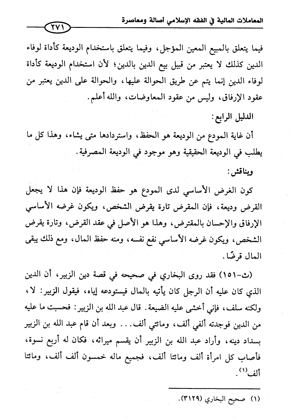 (ث - ١٥١) فقد روى البخاري في صحيحه في قصة دين الزبير، أن الدين الذي كان عليه أن الرجل كان يأتيه بالمال فيستودعه إياه، فيقول الزبير: لا، ولكنه سلف، فإني أخشى عليه الضيعة. قال عبد الله بن الزبير: فحسبت ما عليه من الدين فوجدته ألفي ألف، ومائتي ألف ... وبعد أن قام عبد الله بن الزبير بسداد دينه، وأراد عبد الله بن الزبير أن يقسم ميراثه، فكان له أربع نسوة، فأصاب كل امرأة ألف ومائتا ألف، فجميع ماله خمسون ألف ألف، ومائتا ألف (¬١).