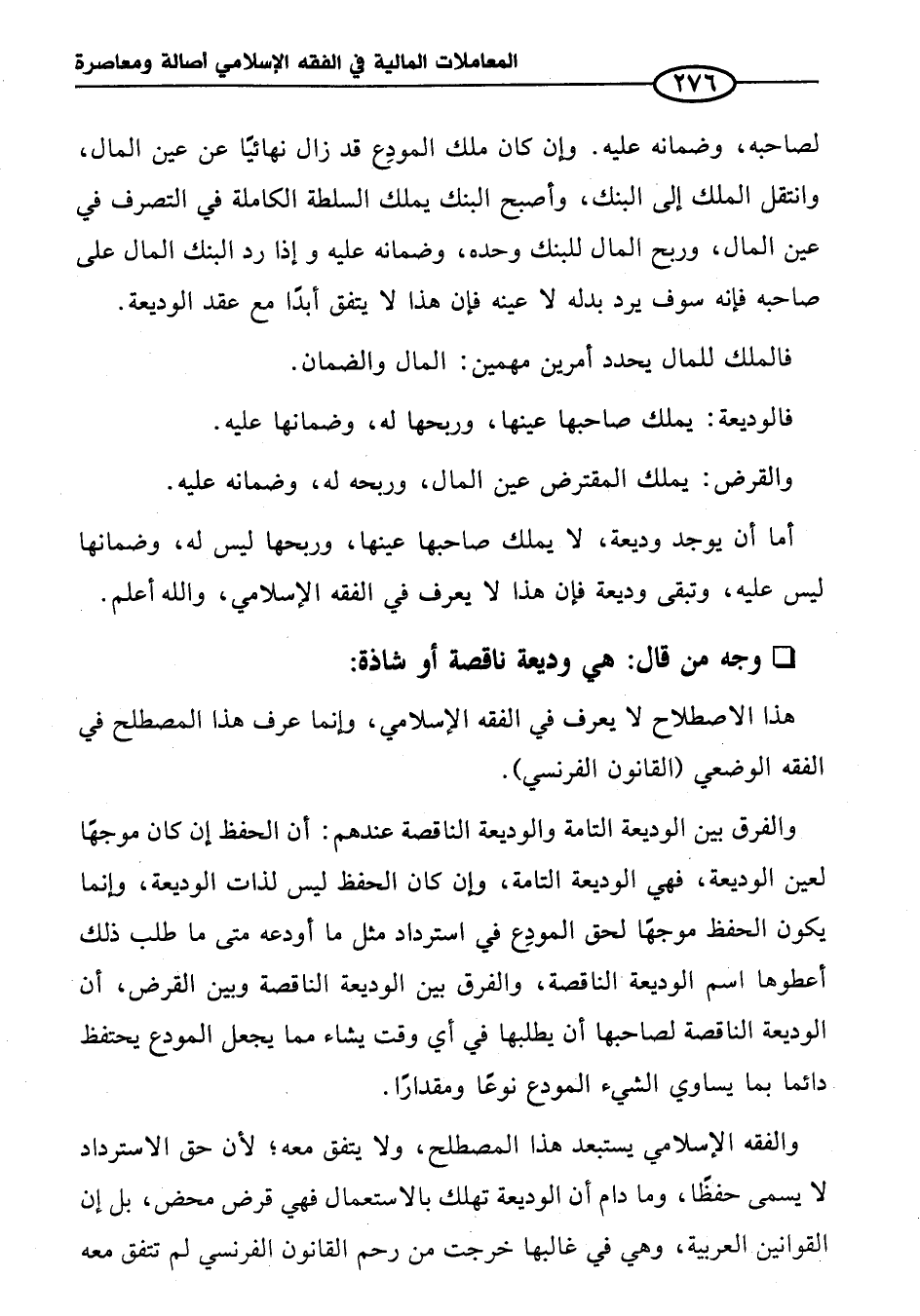 والفقه الإسلامي يستبعد هذا المصطلح، ولا يتفق معه؛ لأن حق الاسترداد لا يسمى حفظًا، وما دام أن الوديعة تهلك بالاستعمال فهي قرض محض، بل إن القوانين العربية، وهي في غالبها خرجت من رحم القانون الفرنسي لم تتفق معه