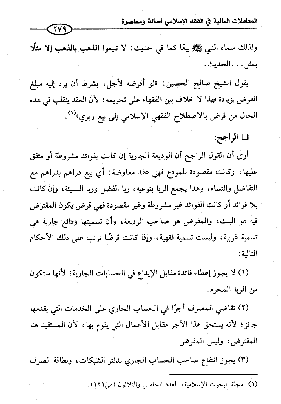 أرى أن القول الراجح أن الوديعة الجارية إن كانت بفوائد مشروطة أو متفق عليها، وكانت مقصودة للمودع فهي عقد معاوضة: أي بيع دراهم بدراهم مع التفاضل والنساء، وهذا يجمع الربا بنوعيه، ربا الفضل وربا النسيئة، وإن كانت بلا فوائد أو كانت الفوائد غير مشروطة وغير مقصودة فهي قرض يكون المقترض فيه هو البنك، والمقرض هو صاحب الوديعة، وأن تسميتها ودائع جارية هي تسمية غربية، وليست تسمية فقهية، وإذا كانت قرضًا ترتب على ذلك الأحكام التالية: