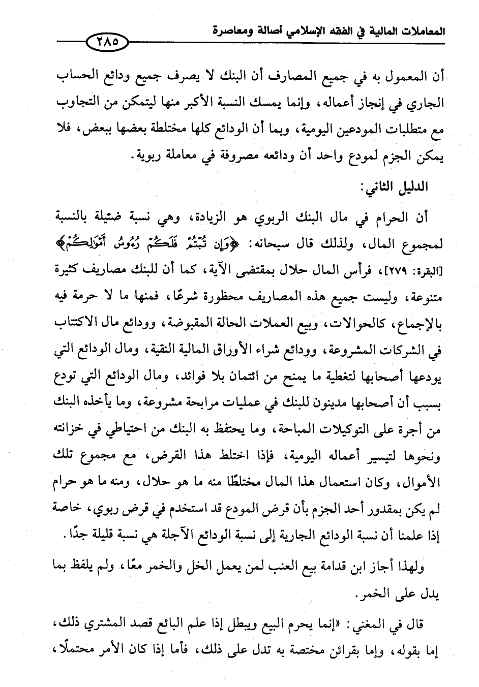 أن المعمول به في جميع المصارف أن البنك لا يصرف جميع ودائع الحساب البخاري في إنجاز أعماله، وإنما يمسك النسبة الأكبر منها ليتمكن من التجاوب مع متطلبات المودعين اليومية، وبما أن الودائع كلها مختلطة بعضها ببعض، فلا يمكن الجزم لمودع واحد أن ودائعه مصروفة في معاملة ربوية.