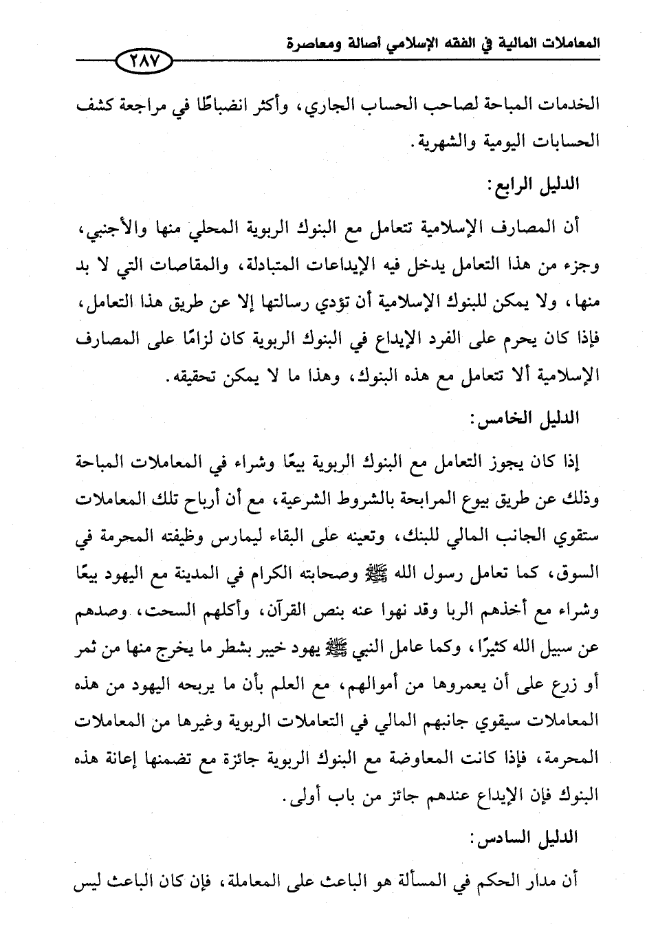 أن المصارف الإِسلامية تتعامل مع البنوك الربوية المحلي منها والأجنبي، وجزء من هذا التعامل يدخل فيه الإيداعات المتبادلة، والمقاصات التي لا بد منها, ولا يمكن للبنوك الإِسلامية أن تؤدي رسالتها إلا عن طريق هذا التعامل، فإذا كان يحرم على الفرد الإيداع في البنوك الربوية كان لزامًا على المصارف الإِسلامية ألا تتعامل مع هذه البنوك، وهذا ما لا يمكن تحقيقه.