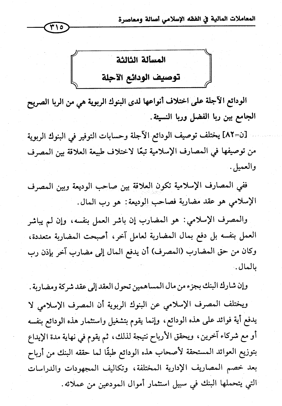 [ن - ٨٢] يختلف توصيف الودائع الآجلة وحسابات التوفير في البنوك الربوية من توصيفها في المصارف الإسلامية تبعًا لاختلاف طبيعة العلاقة بين المصرف والعميل.