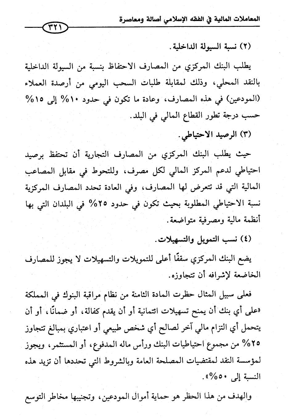 حيث يطلب البنك المركزي من المصارف التجارية أن تحتفظ برصيد احتياطي لدعم المركز المالي لكل مصرف، وللتحوط في مقابل المصاعب المالية التي قد تتعرض لها المصارف، وفي العادة تحدد المصارف المركزية نسبة الاحتياطي المطلوبة بحيث تكون في حدود ٢٥ % في البلدان التي بها أنظمة مالية ومصرفية متواضعة.