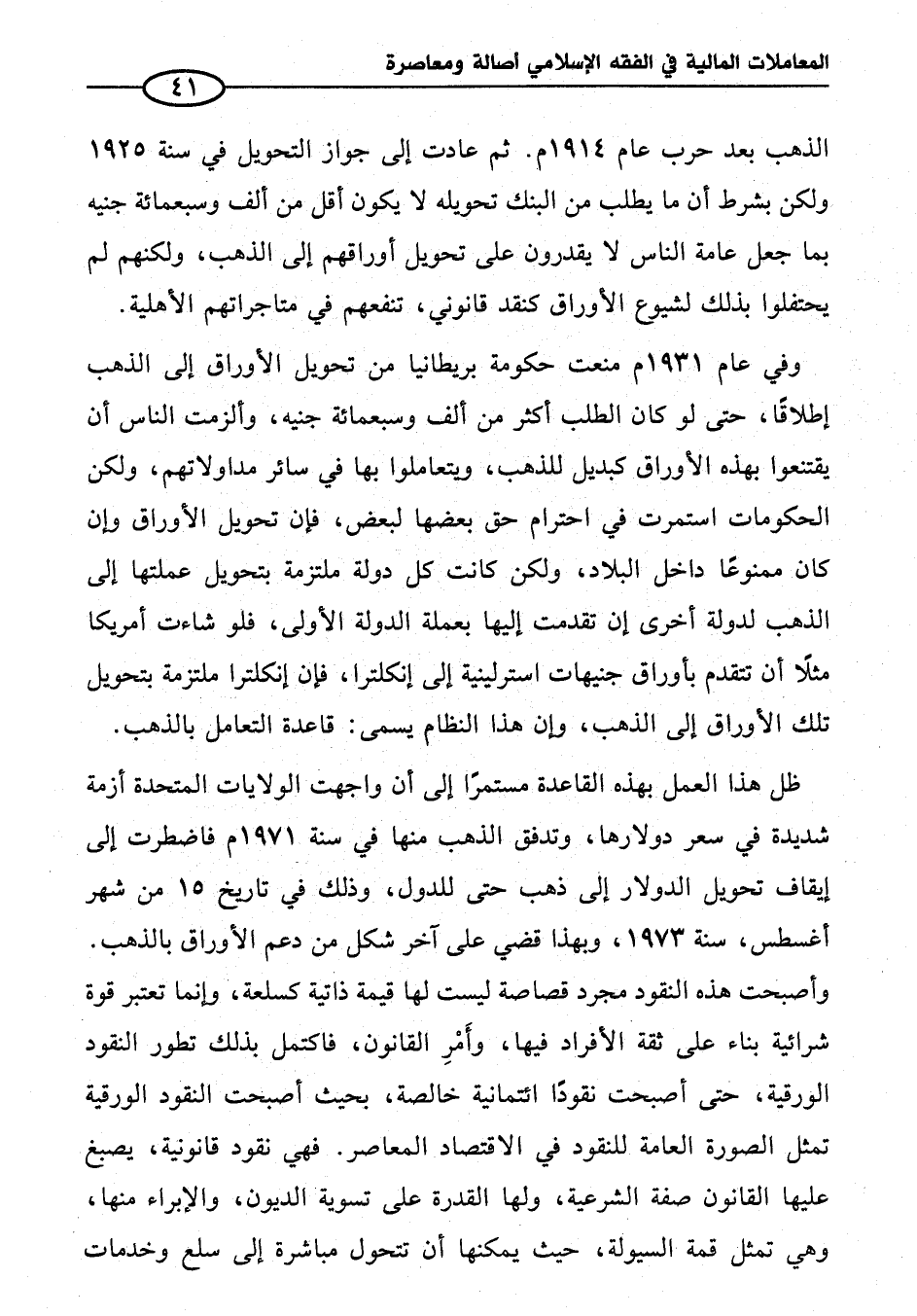 وفي عام ١٩٣١ م منعت حكومة بريطانيا من تحويل الأوراق إلى الذهب إطلاقًا، حتى لو كان الطلب أكثر من ألف وسبعمائة جنيه، وألزمت الناس أن يقتنعوا بهذه الأوراق كبديل للذهب، ويتعاملوا بها في سائر مداولاتهم، ولكن الحكومات استمرت في احترام حق بعضها لبعض، فإن تحويل الأوراق وإن كان ممنوعًا داخل البلاد، ولكن كانت كل دولة ملتزمة بتحويل عملتها إلى الذهب لدولة أخرى إن تقدمت إليها بعملة الدولة الأولى، فلو شاءت أمريكا مثلًا أن تتقدم بأوراق جنيهات استرلينية إلى إنكلترا، فإن إنكلترا ملتزمة بتحويل تلك الأوراق إلى الذهب، وإن هذا النظام يسمى: قاعدة التعامل بالذهب.