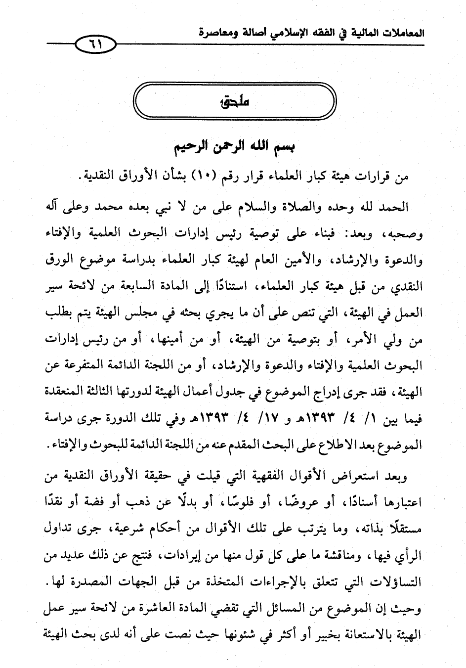 الحمد لله وحده والصلاة والسلام على من لا نبي بعده محمَّد وعلى آله وصحبه، وبعد: فبناء على توصية رئيس إدارات البحوث العلمية والإفتاء والدعوة والإرشاد، والأمين العام لهيئة كبار العلماء بدراسة موضوع الورق النقدي من قبل هيئة كبار العلماء، استنادًا إلى المادة السابعة من لائحة سير العمل في الهيئة، التي تنص على أن ما يجري بحثه في مجلس الهيئة يتم بطلب من ولي الأمر، أو بتوصية من الهيئة، أو من أمينها، أو من رئيس إدارات البحوث العلمية والإفتاء والدعوة والإرشاد، أو من اللجنة الدائمة المتفرعة عن الهيئة، فقد جرى إدراج الموضوع في جدول أعمال الهيئة لدورتها الثالثة المنعقدة فيما بين ١/ ٤/ ١٣٩٣ هـ