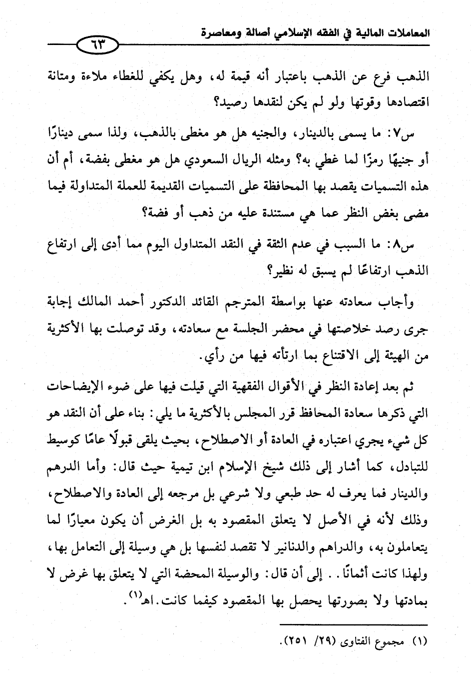 ثم بعد إعادة النظر في الأقوال الفقهية التي قيلت فيها على ضوء الإيضاحات التي ذكرها سعادة المحافظ قرر المجلس بالأكثرية ما يلي: بناء على أن النقد هو كل شيء يجري اعتباره في العادة أو الاصطلاح، بحيث يلقى قبولًا عامًا كوسيط للتبادل، كما أشار إلى ذلك شيخ الإِسلام ابن تيمية حيث قال: وأما الدرهم والدينار فما يعرف له حد طبعي ولا شرعي بل مرجعه إلى العادة والاصطلاح، وذلك لأنه في الأصل لا يتعلق المقصود به بل الغرض أن يكون معيارًا لما يتعاملون به، والدراهم والدنانير لا تقصد لنفسها بل هي وسيلة إلى التعامل بها، ولهذا كانت أثمانًا .. إلى أن قال: والوسيلة المحضة التي لا يتعلق بها غرض لا بمادتها ولا بصورتها يحصل بها المقصود كيفما كانت. اهـ (¬١).