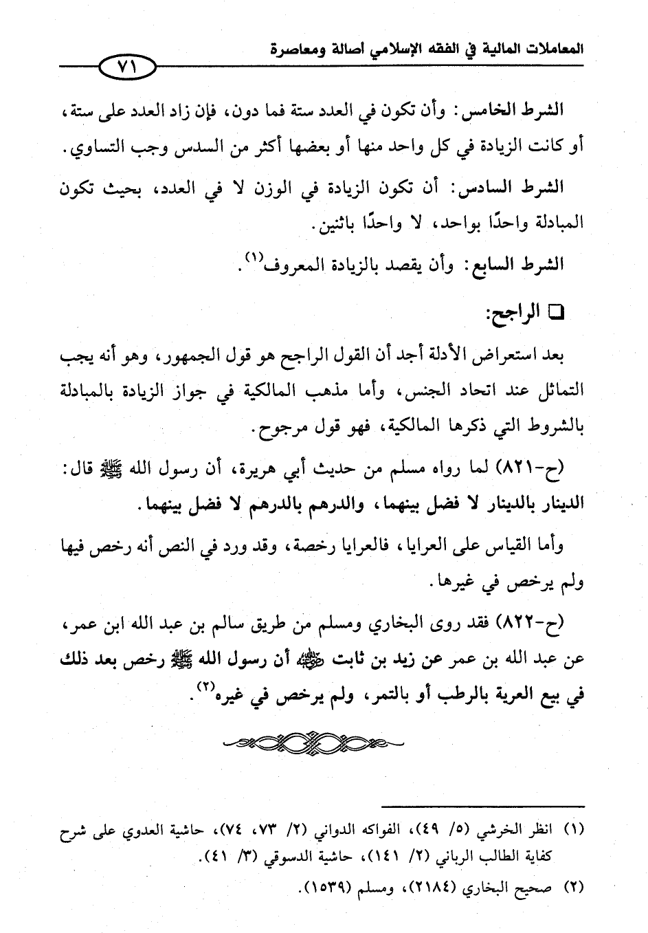 الشرط السادس: أن تكون الزيادة في الوزن لا في العدد، بحيث تكون المبادلة واحداً بواحد، لا واحداً باثنين.