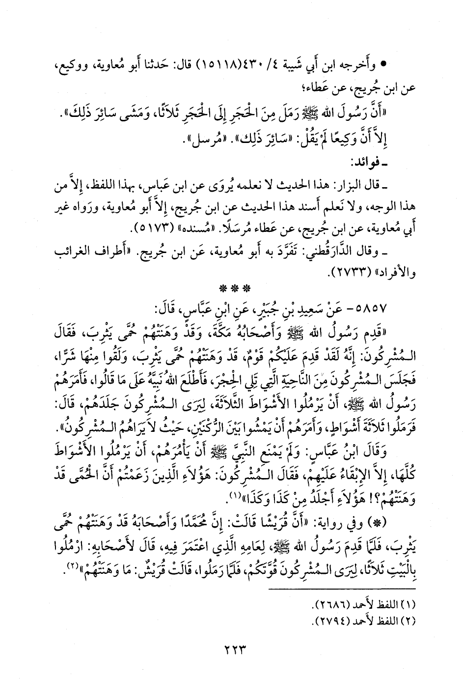- وفي رواية: «أن قريشا قالت: إن محمدا وأصحابه قد وهنتهم حمى يثرب، فلما قدم رسول الله صَلى الله عَليه وسَلم لعامه الذي اعتمر فيه، قال لأصحابه: ارملوا بالبيت ثلاثا، ليرى المشركون قوتكم، فلما رملوا، قالت قريش: ما وهنتهم» (¬٢).