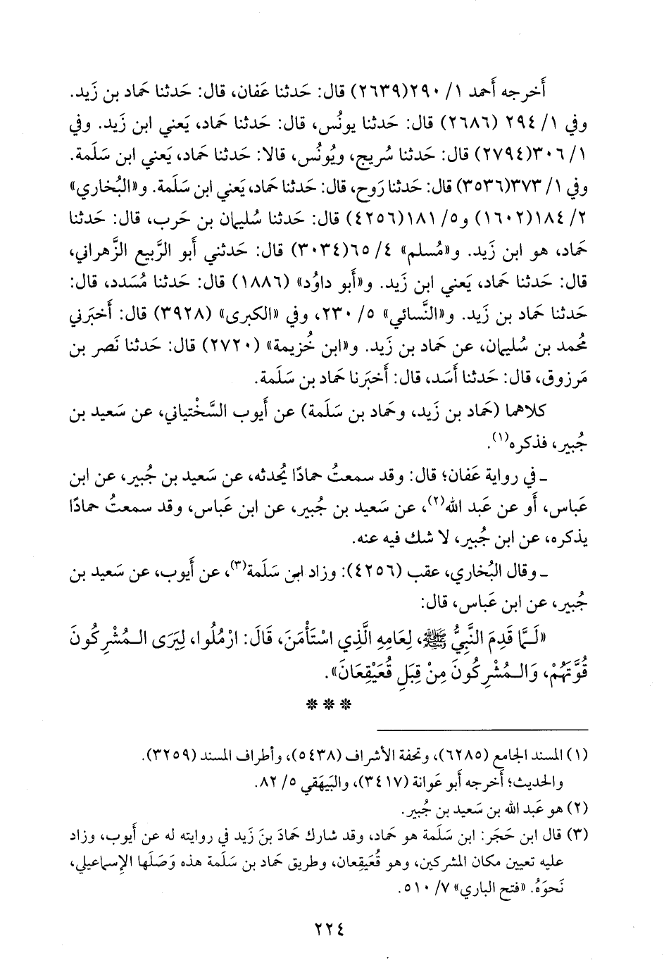 (¬٣) قال ابن حجر: ابن سلمة هو حماد، وقد شارك حماد بن زيد في روايته له عن أيوب، وزاد عليه تعيين مكان المشركين، وهو قعيقعان، وطريق حماد بن سلمة هذه وصلها الإسماعيلي، نحوه. «فتح الباري» ٧/ ٥١٠.