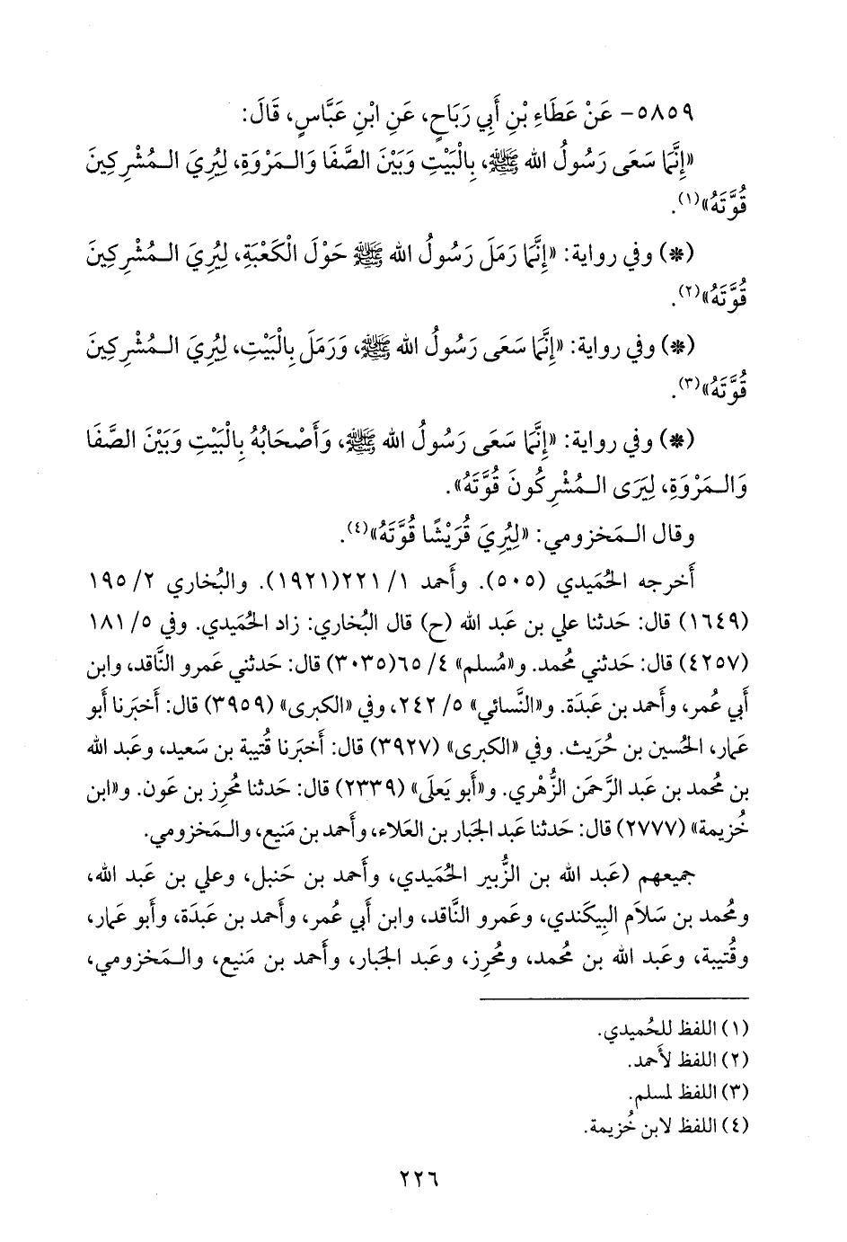 - وفي رواية: «إنما سعى رسول الله صَلى الله عَليه وسَلم وأصحابه بالبيت وبين الصفا والمروة، ليرى المشركون قوته».