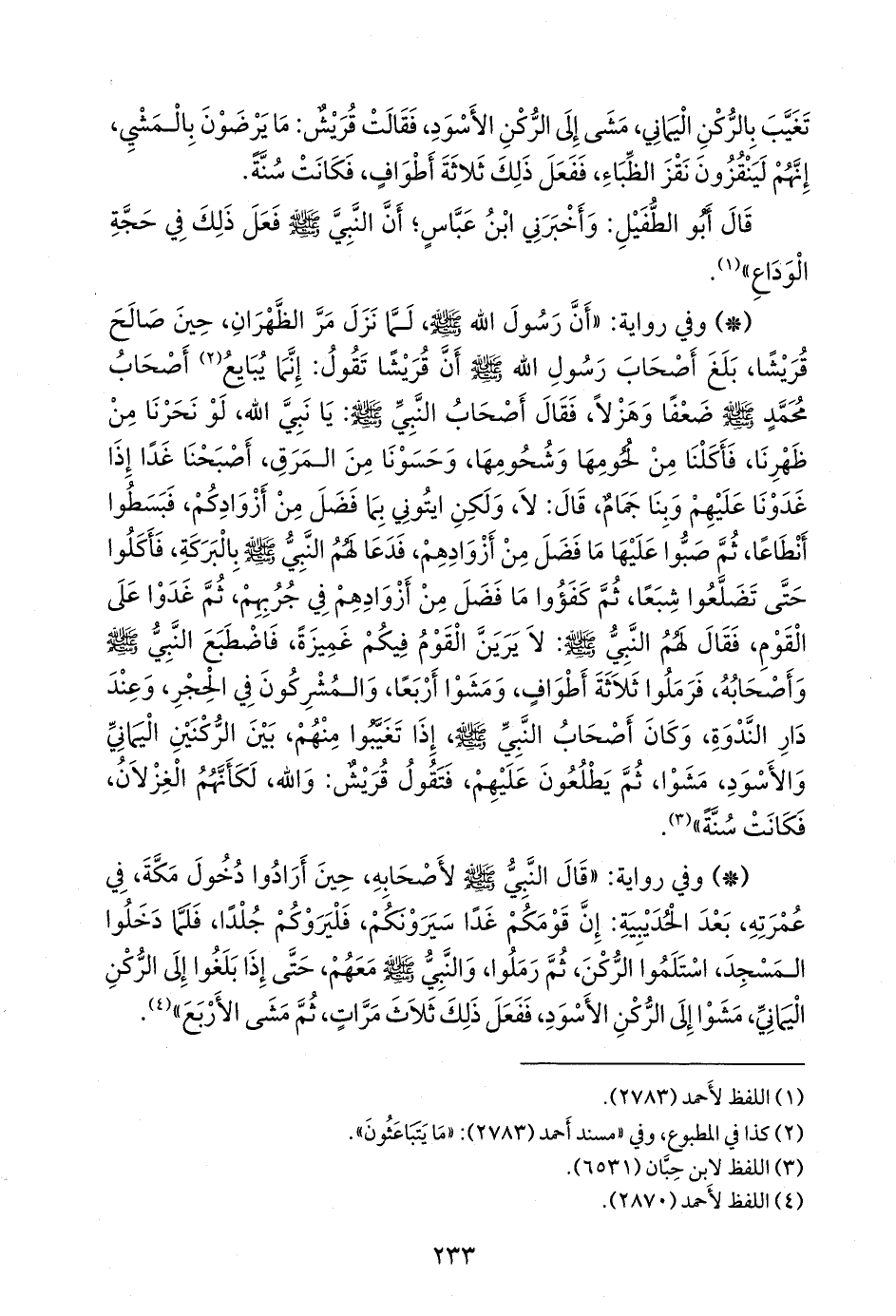 - وفي رواية: «قال النبي صَلى الله عَليه وسَلم لأصحابه، حين أرادوا دخول مكة، في عمرته، بعد الحُدَيبيَة: إن قومكم غدا سيرونكم، فليروكم جلدا، فلما دخلوا المسجد، استلموا الركن، ثم رملوا، والنبي صَلى الله عَليه وسَلم معهم، حتى إذا بلغوا إلى الركن اليماني، مشوا إلى الركن الأسود، ففعل ذلك ثلاث مرات، ثم مشى الأربع» (¬٣).