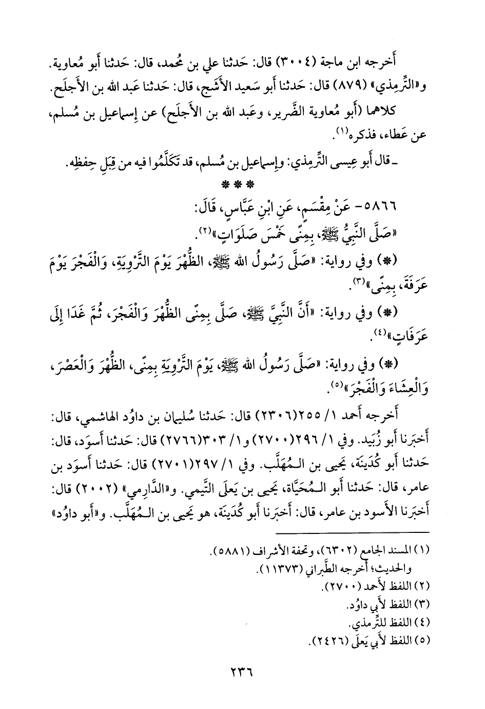 - وفي رواية: «صلى رسول الله صَلى الله عَليه وسَلم يوم التروية بمنى، الظهر والعصر, والعشاء والفجر» (¬٤).