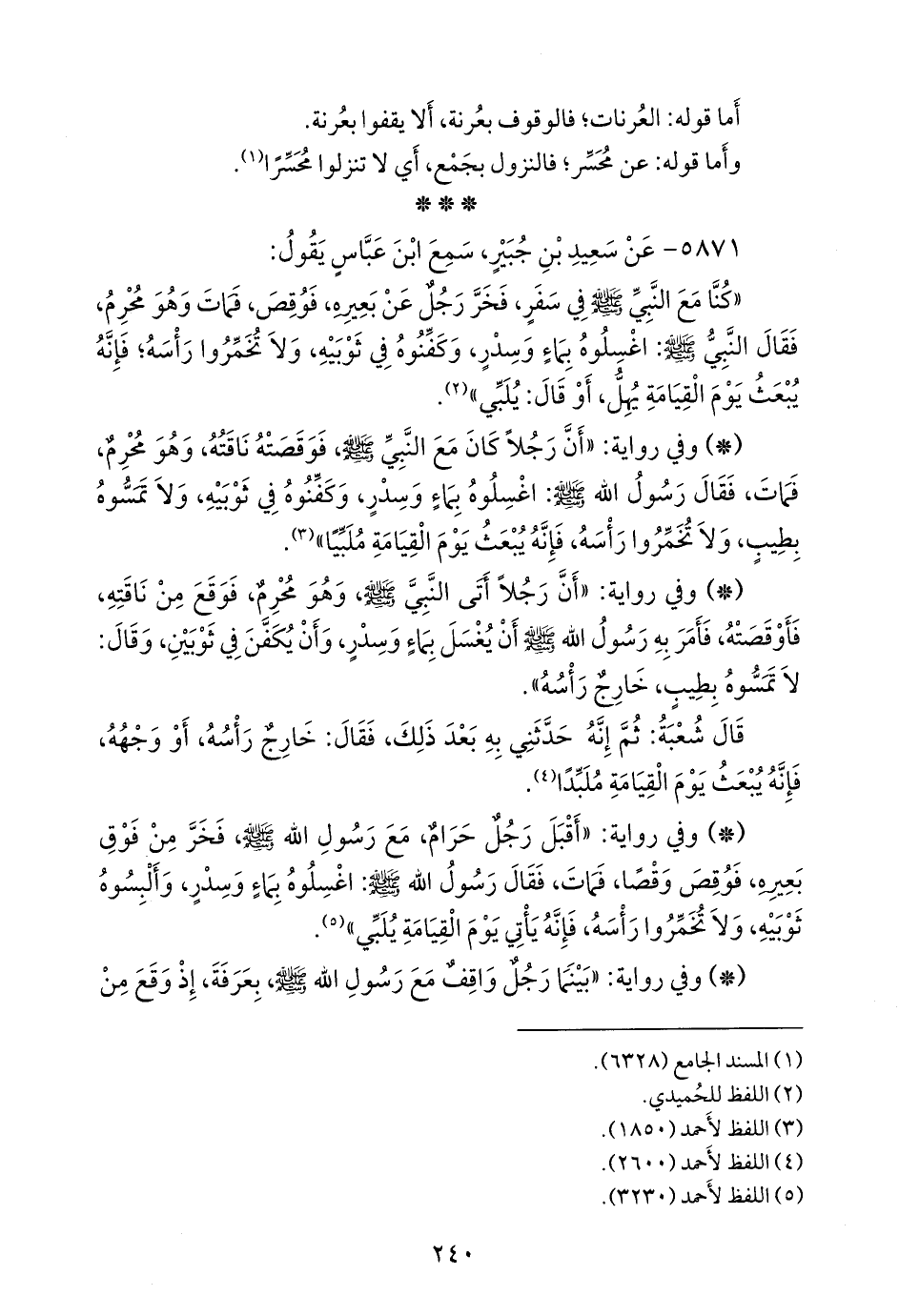 - وفي رواية: «أقبل رجل حرام، مع رسول الله صَلى الله عَليه وسَلم فخر من فوق بعيره، فوقص وقصا، فمات، فقال رسول الله صَلى الله عَليه وسَلم: اغسلوه بماء وسدر، وألبسوه ثوبيه، ولا تخمروا رأسه، فإنه يأتي يوم القيامة يلبي» (¬٤).
