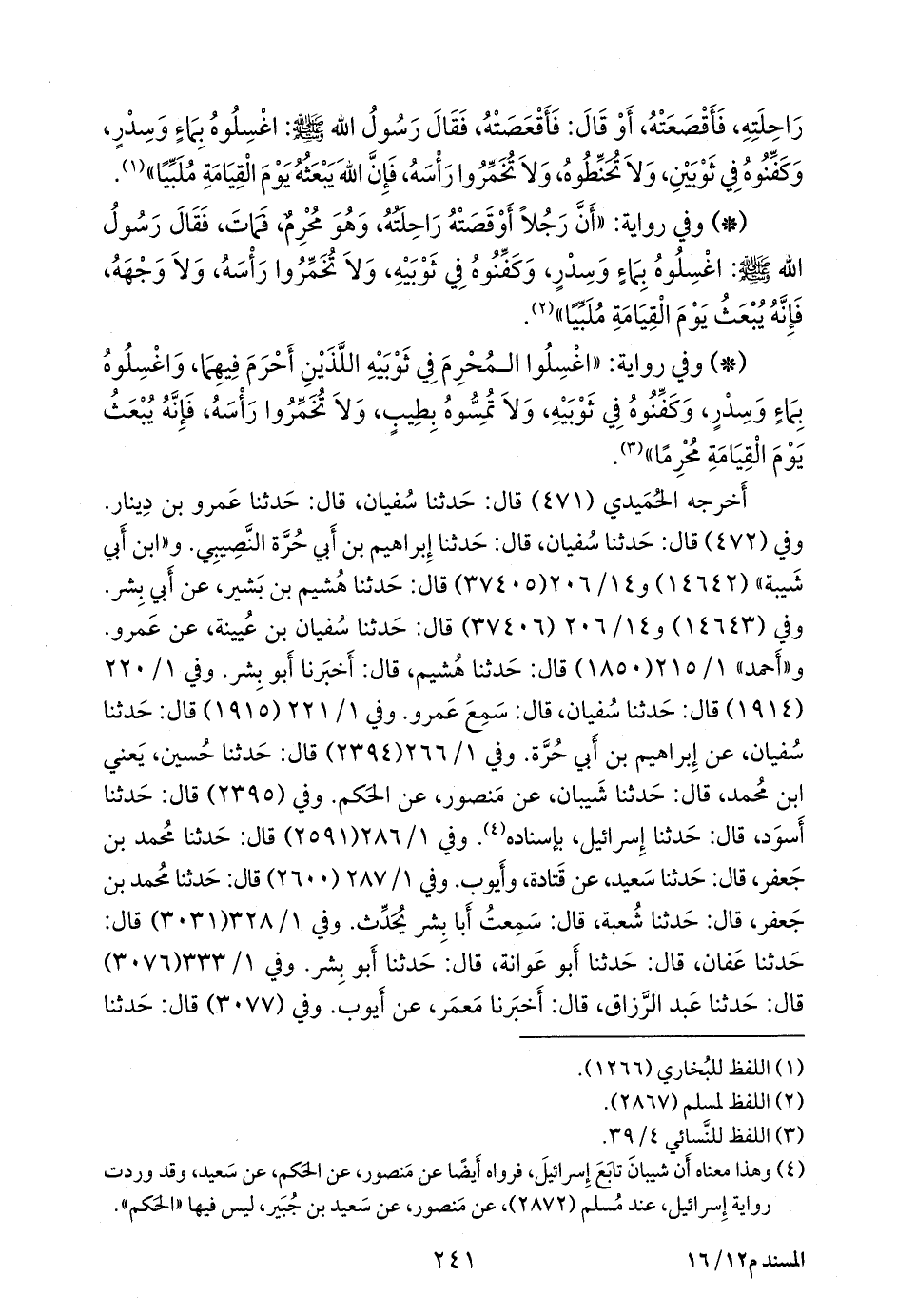 عبد الرزاق, قال معمر: وأخبرني عبد الكريم الجزري. وفي ١/ ٣٤٦ (٣٢٣٠) قال: حدثنا يحيى, عن ابن جُريج، قال: حدثني عَمرو بن دينار. و «الدَّارِمي» (١٩٨٣) قال: أخبرنا سليمان بن حرب، قال: حدثنا حماد، هو ابن زيد، عن أيوب. و «البخاري» ٢/ ٧٥ (١٢٦٥) قال: حدثنا أَبو النعمان، قال: حدثنا حماد بن زيد، عن أيوب. وفي (١٢٦٦) قال: حدثنا قتيبة، قال: حدثنا حماد، عن أيوب. وفي (١٢٦٧) قال: حدثنا أَبو النعمان، قال: أخبرنا أَبو عَوانة، عن أبي بشر. وفي (١٢٦٨) قال: حدثنا مُسدد، قال: حدثنا حماد بن زيد، عن عَمرو، وأيوب. وفي ٣/ ١٥ (١٨٣٩) قال: حدثنا قتيبة، قال: حدثنا جرير، عن منصور، عن الحكم. وفي ٣/ ١٧ (١٨٤٩) قال: حدثنا سليمان بن حرب، قال: حدثنا حماد بن زيد، عن عَمرو بن دينار. وفي (١٨٥٠) قال: حدثنا سليمان بن حرب، قال: حدثنا حماد بن زيد، عن أيوب. وفي (١٨٥١) قال: حدثنا يعقوب بن إبراهيم، قال: حدثنا هُشيم، قال: أخبرنا أَبو بشر. و «مسلم» ٤/ ٢٣ (٢٨٦٢) قال: حدثنا أَبو بكر بن أبي شيبة، قال: حدثنا سفيان بن عُيينة، عن عَمرو. وفي (٢٨٦٣) قال: وحدثنا أَبو الربيع الزهراني، قال: حدثنا حماد، عن عَمرو بن دينار، وأيوب. وفي ٤/ ٢٤ (٢٨٦٤) قال: حدثنيه عَمرو الناقد، قال: حدثنا إسماعيل بن إبراهيم، عن أيوب، قال: نبئت عن سعيد بن جبير (¬١). وفي ٤/ ٢٤ (٢٨٦٥) قال: وحدثنا علي بن خَشرَم، قال: أخبرنا عيسى، يعني ابن يونس، عن ابن جُريج، قال: أخبرني عَمرو بن دينار.