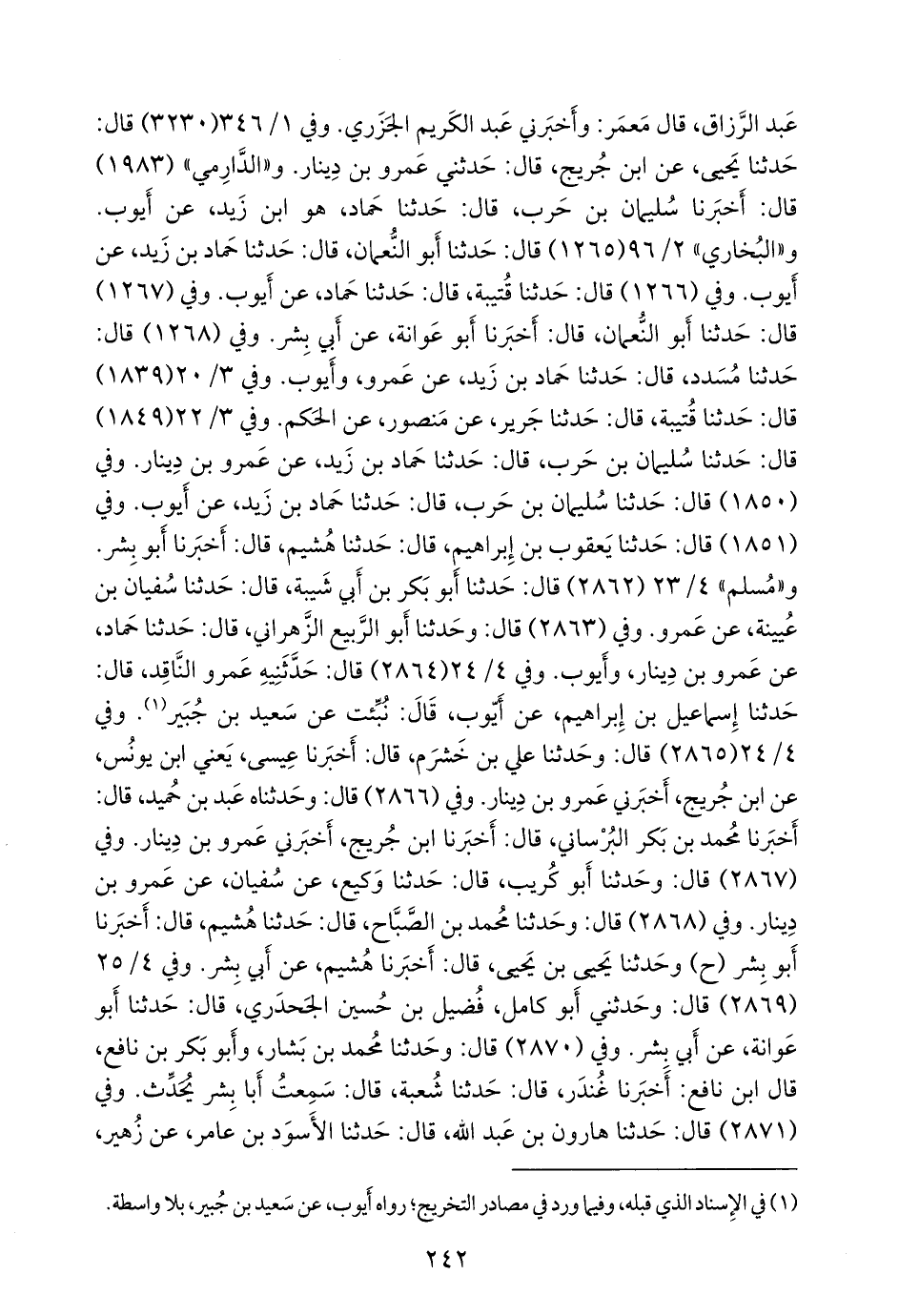 وفي (٢٨٦٦) قال: وحدثناه عَبد بن حُميد، قال: أخبرنا محمد بن بكر البُرساني، قال: أخبرنا ابن جُريج، قال: أخبرني عَمرو بن دينار. وفي (٢٨٦٧) قال: وحدثنا أَبو كُريب، قال: حدثنا وكيع، عن سفيان، عن عَمرو بن دينار. وفي (٢٨٦٨) قال: وحدثنا محمد بن الصباح، قال: حدثنا هُشيم، قال: أخبرنا أَبو بشر (ح) وحدثنا يحيى بن يحيى، قال: أخبرنا هُشيم، عن أبي بشر. وفي ٤/ ٢٥ (٢٨٦٩) قال: وحدثني أَبو كامل فُضيل بن حسين الجَحدري، قال: حدثنا أَبو عَوانة، عن أبي بشر. وفي (٢٨٧٠) قال: وحدثنا محمد بن بشار، وأَبو بكر بن نافع، قال ابن نافع: أخبرنا غُندَر، قال: حدثنا شعبة، قال: سمعت أبا بشر يحدث. وفي (٢٨٧١) قال: حدثنا هارون بن عبد الله، قال: حدثنا الأسود بن عامر، عن زهير،