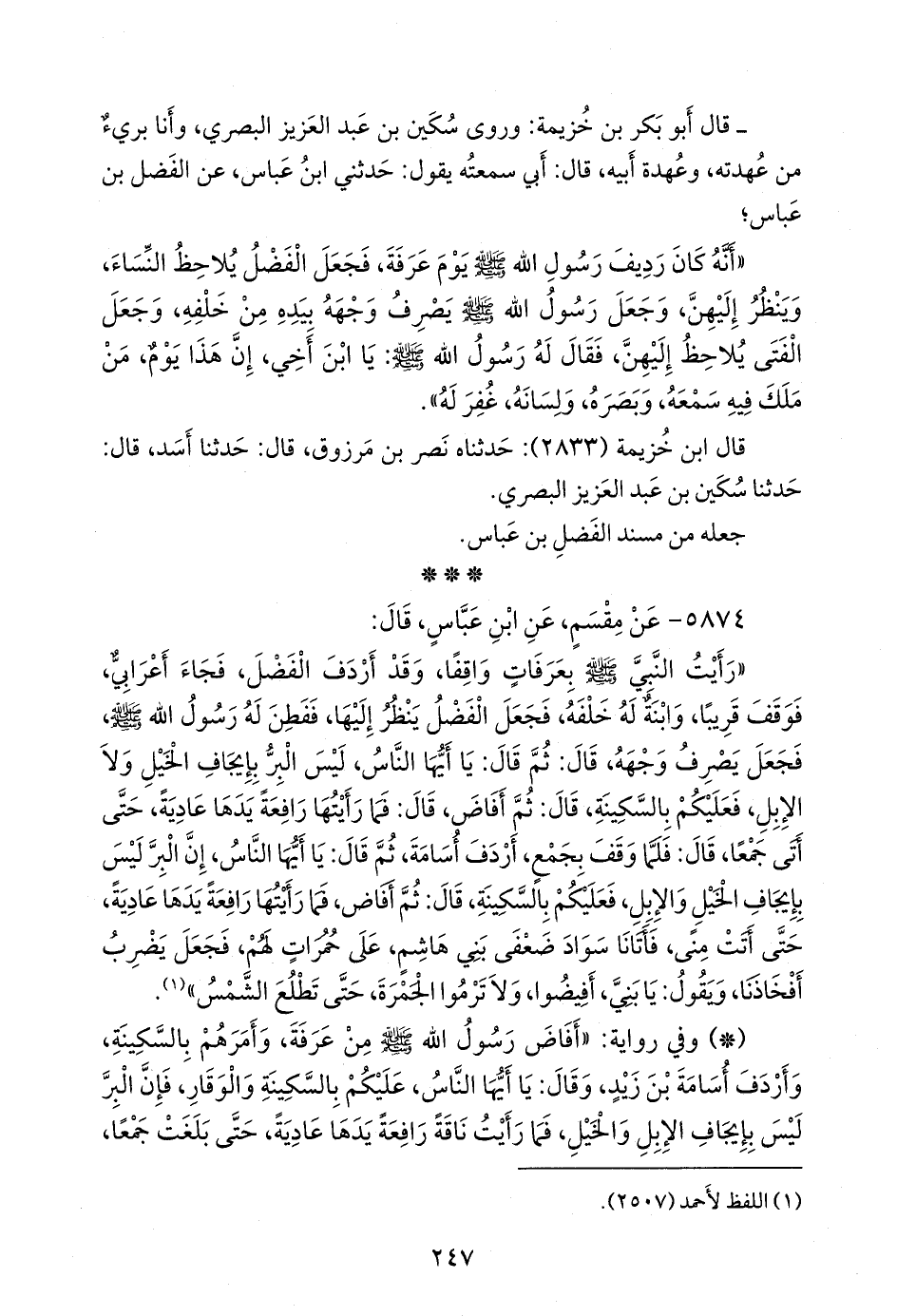«رأيت النبي صَلى الله عَليه وسَلم بعرفات واقفا، وقد أردف الفضل، فجاء أعرابي، فوقف قريبا، وابنة له خلفه، فجعل الفضل ينظر إليها، ففطن له رسول الله صَلى الله عَليه وسَلم فجعل يصرف وجهه، قال: ثم قال: يا أيها الناس، ليس البر بإيجاف الخيل ولا الإبل، فعليكم بالسكينة، قال: ثم أفاض، قال: فما رأيتها رافعة يدها عادية، حتى أتى جمعا، قال: فلما وقف بجمع، أردف أُسامة، ثم قال: يا أيها الناس، إن البر ليس بإيجاف الخيل والإبل، فعليكم بالسكينة، قال: ثم أفاض، فما رأيتها رافعة يدها عادية، حتى أتت منى، فأتانا سواد ضعفى بني هاشم، على حمرات لهم، فجعل يضرب أفخاذنا، ويقول: يا بني، أفيضوا، ولا ترموا الجمرة، حتى تطلع الشمس» (¬١).