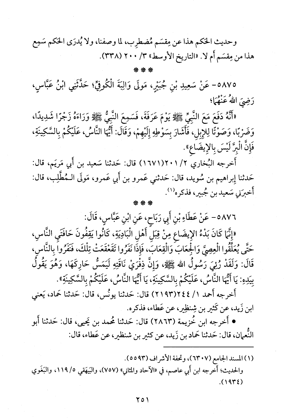 «إنما كان بدء الإيضاع من قبل أهل البادية، كانوا يقفون حافتي الناس، حتى يعلقوا العصي والجعاب والقعاب، فإذا نفروا تقعقعت تلك، فنفروا بالناس، قال: ولقد رئي رسول الله صَلى الله عَليه وسَلم وإن ذفري ناقته ليمس حاركها، وهو يقول بيده: يا أيها الناس، عليكم بالسكينة، يا أيها الناس، عليكم بالسكينة».