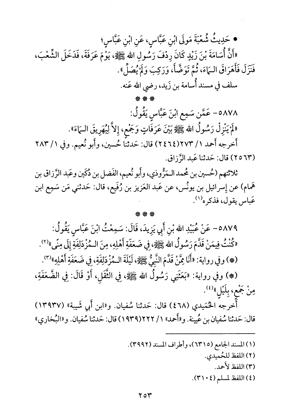 - رواه ابن أَبي فديك، عن ابن أَبي ذِئب، عن شعبة، عن ابن عباس، عن أُسامة، وسلف في مسند أُسامة بن زيد، رضي الله عنه، برقم (١٢٦).