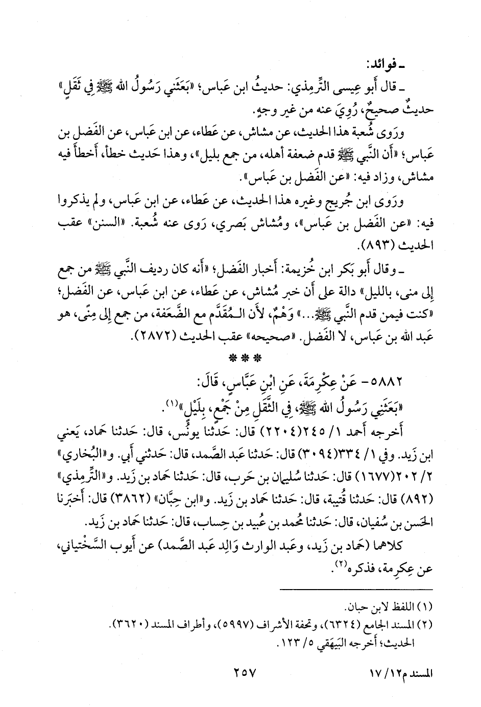 - وقال ابن خزيمة: أَخبار الفضل؛ أَنه كان رديف النبي صَلى الله عَليه وسَلم من جمع إِلى منى، بالليل، دالة على أَن خبر مُشَاش، عن عطاء، عن ابن عباس، عن الفضل؛ كنتُ فيمن قَدَّم النبي صَلى الله عَليه وسَلم وَهْمٌ، لأَن المُقَدَّم مع الضَّعَفة من جَمْع إِلى مِنًى هو عبد الله بن عباس، لا الفضل. «صحيحه» (٢٨٧٢).