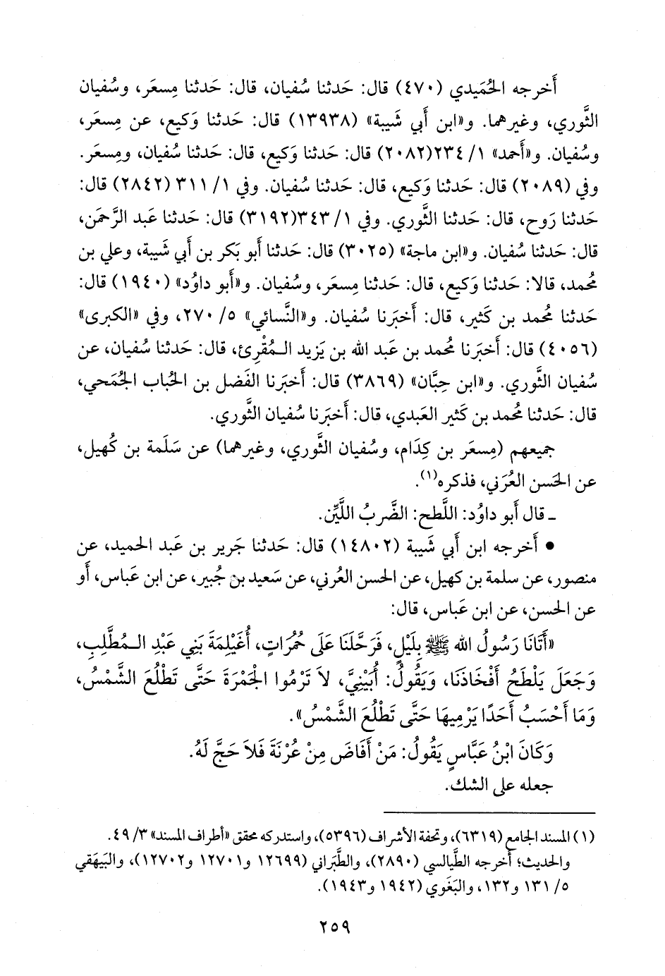 و «ابن ماجة» (٣٠٢٥) قال: حدثنا أَبو بكر بن أبي شيبة، وعلي بن محمد، قالا: حدثنا وكيع، قال: حدثنا مسعر، وسفيان. و «أَبو داود» (١٩٤٠) قال: حدثنا محمد بن كثير، قال: أخبرنا سفيان. و «النَّسَائي» ٥/ ٢٧٠، وفي «الكبرى» (٤٠٥٦) قال: أخبرنا محمد بن عبد الله بن يزيد المُقرِئ، قال: حدثنا سفيان، عن سفيان الثوري. و «ابن حِبَّان» (٣٨٦٩) قال: أخبرنا الفضل بن الحُبَاب الجُمحي، قال: حدثنا محمد بن كثير العبدي، قال: أخبرنا سفيان الثوري.