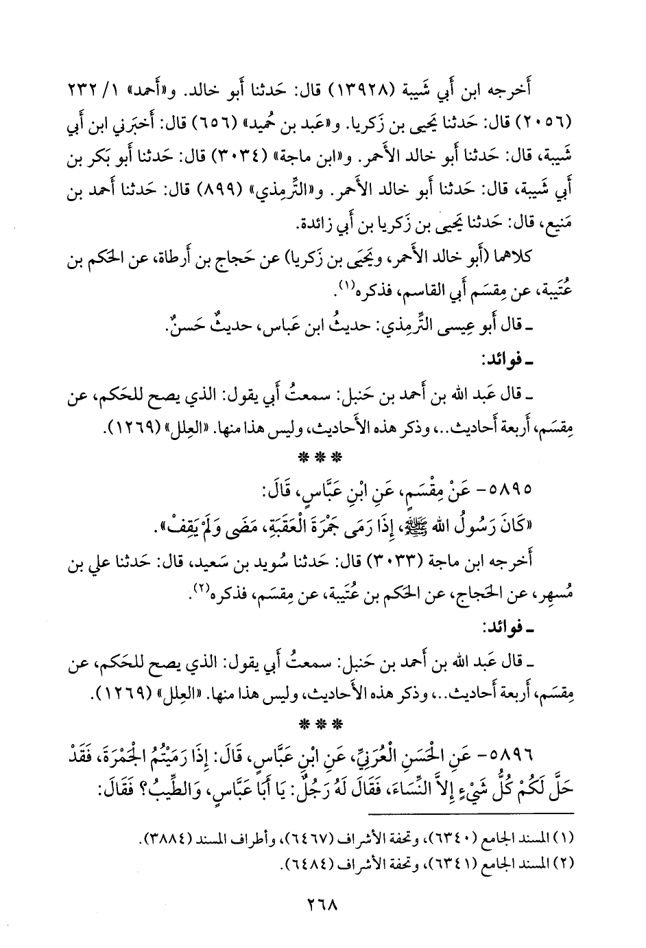 - وفي رواية: «عن ابن عباس، قال: قال رسول الله صَلى الله عَليه وسَلم: إذا رميتم الجمرة، فقد حل لكم كل شيء إلا النساء (¬٢). فقال رجل: والطيب؟ فقال ابن عباس: أما أنا فقد رأيت رسول الله صَلى الله عَليه وسَلم يضمخ رأسه بالسك أفطيب ذاك أم لا؟» (¬٣).