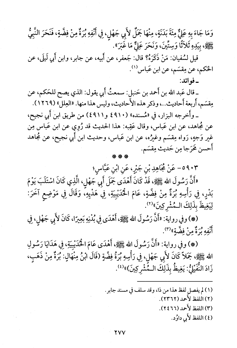 - وفي رواية: «أن رسول الله صَلى الله عَليه وسَلم أهدى عام الحُدَيبيَة، في هدايا رسول الله صَلى الله عَليه وسَلم جملا كان لأبي جهل، في رأسه برة فضة (قال ابن منهال: برة من ذهب، زاد النفيلي: يغيظ بذلك المشركين)» (¬٣).