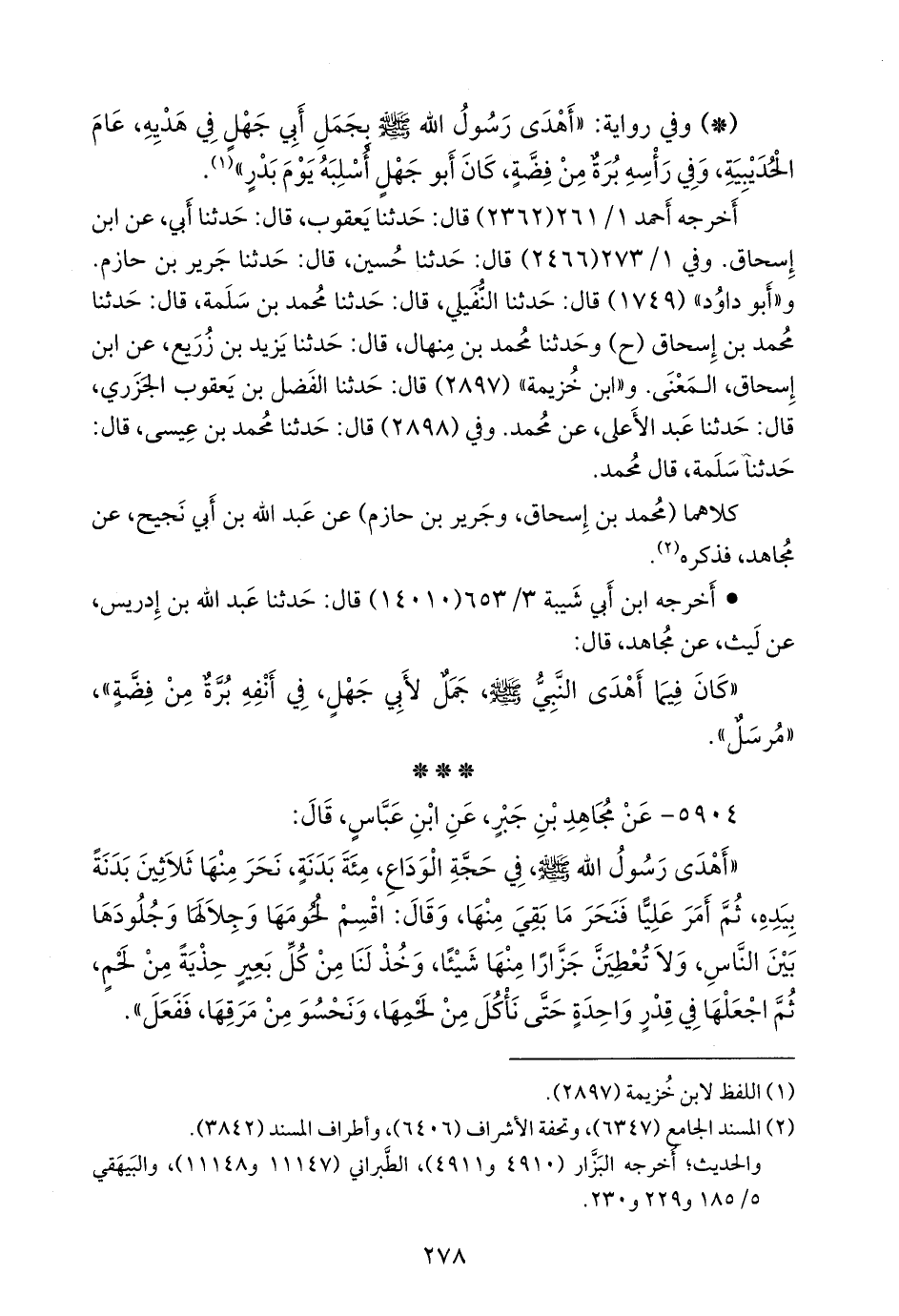 - وفي رواية: «أهدى رسول الله صَلى الله عَليه وسَلم بجمل أبي جهل في هديه، عام الحُدَيبيَة، وفي رأسه برة من فضة، كان أَبو جهل أسلبه يوم بدر» (¬١).
