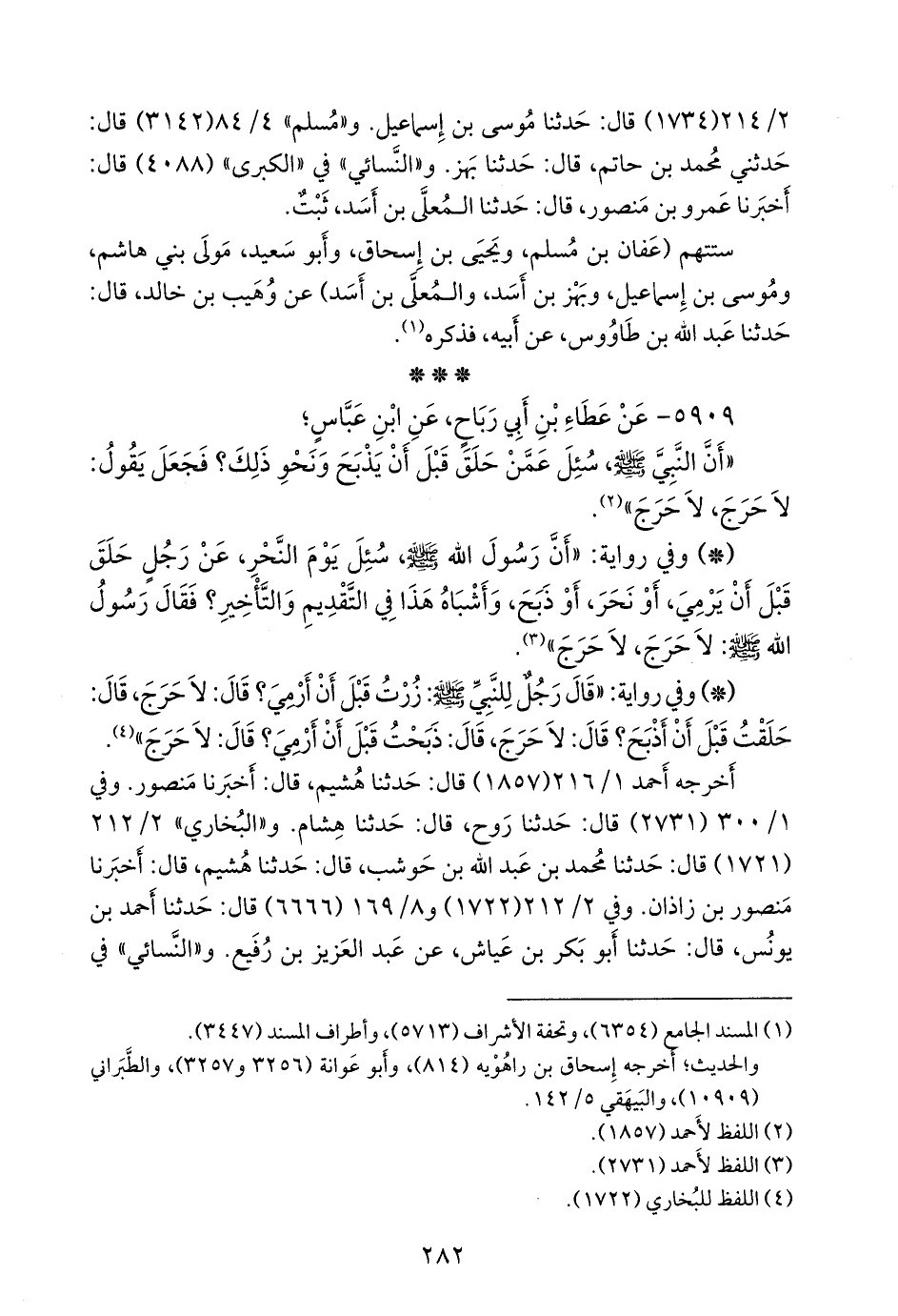 - وفي رواية: «أن رسول الله صَلى الله عَليه وسَلم سئل يوم النحر، عن رجل حلق قبل أن يرمي، أو نحر، أو ذبح، وأشباه هذا في التقديم والتأخير؟ فقال رسول الله صَلى الله عَليه وسَلم: لا حرج، لا حرج» (¬٢).
