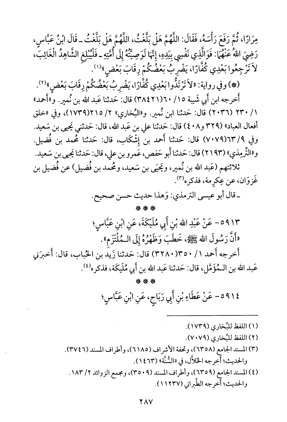 - وفي رواية: «لا ترتدوا بعدي كفارا، يضرب بعضكم رقاب بعض» (¬١).