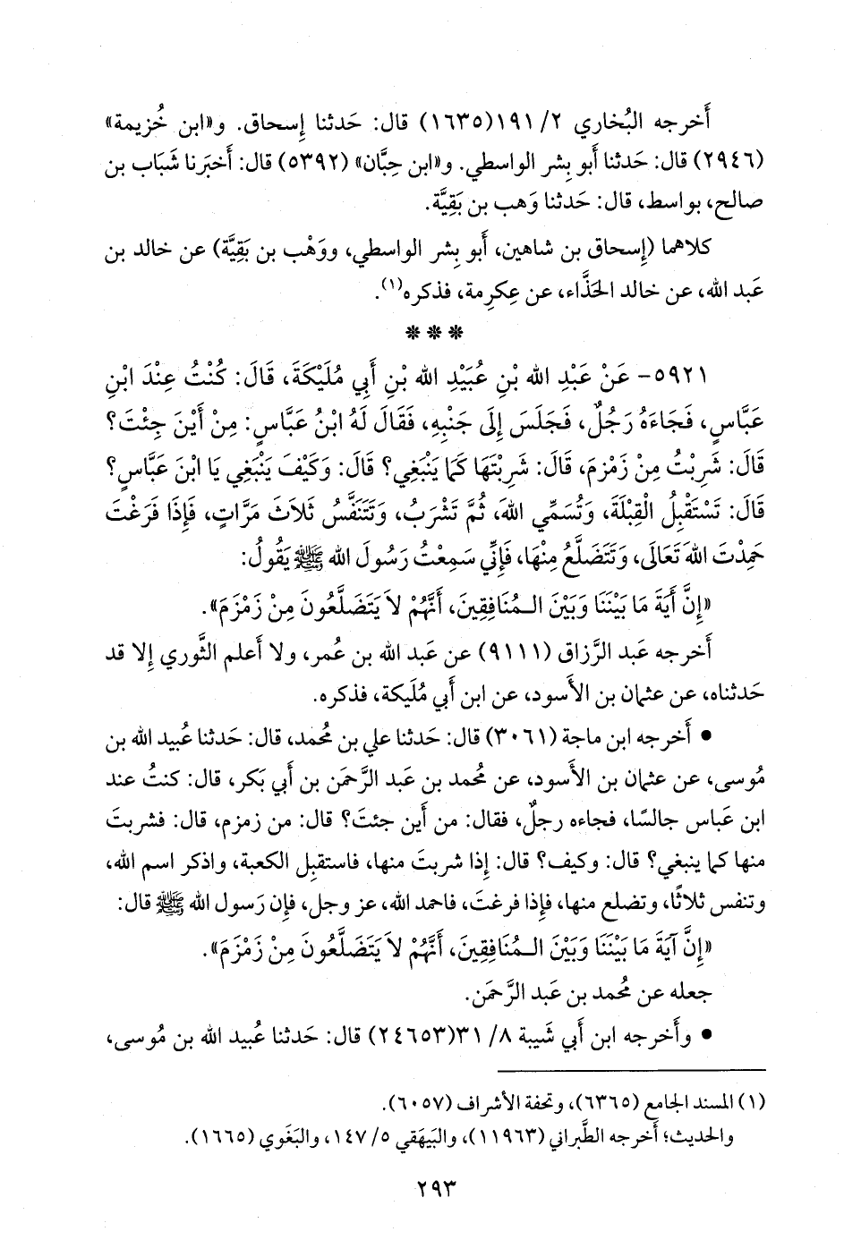 ٥٩٢١ - عن ابن أَبي مُليكة، قال: كنت عند ابن عباس، فجاءه رجل، فجلس إلى جنبه، فقال له ابن عباس: من أين جئت؟ قال: شربت من زمزم، قال: شربتها كما ينبغي؟ قال: وكيف ينبغي يا ابن عباس؟ قال: تستقبل القبلة، وتسمي الله، ثم تشرب، وتتنفس ثلاث مرات، فإذا فرغت حمدت الله تعالى، وتتضلع منها، فإني سمعت رسول الله صَلى الله عَليه وسَلم يقول: